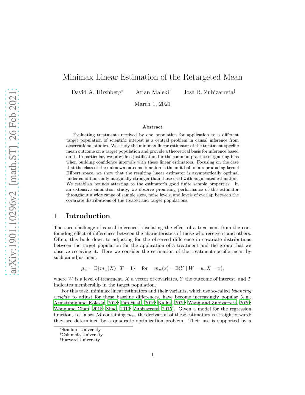 Evaluating treatments received by one population for application to a different target population of scientific interest is a central problem in causal inference from observational studies. We study the minimax linear estimator of the treatment-specific mean outcome on a target population and provide a theoretical basis for inference based on it. In particular, we provide a justification for the common practice of ignoring bias when building confidence intervals with these linear estimators. Focusing on the case that the class of the unknown outcome function is the unit ball of a reproducing kernel Hilbert space, we show that the resulting linear estimator is asymptotically optimal under conditions only marginally stronger than those used with augmented estimators. We establish bounds attesting to the estimator's good finite sample properties. In an extensive simulation study, we observe promising performance of the estimator throughout a wide range of sample sizes, noise levels, and levels of overlap between the covariate distributions of the treated and target populations.