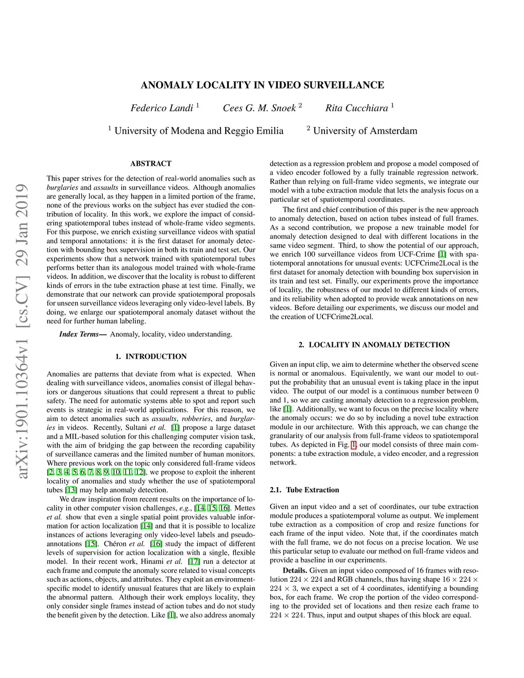 This paper strives for the detection of real-world anomalies such as burglaries and assaults in surveillance videos. Although anomalies are generally local, as they happen in a limited portion of the frame, none of the previous works on the subject has ever studied the contribution of locality. In this work, we explore the impact of considering spatiotemporal tubes instead of whole-frame video segments. For this purpose, we enrich existing surveillance videos with spatial and temporal annotations: it is the first dataset for anomaly detection with bounding box supervision in both its train and test set. Our experiments show that a network trained with spatiotemporal tubes performs better than its analogous model trained with whole-frame videos. In addition, we discover that the locality is robust to different kinds of errors in the tube extraction phase at test time. Finally, we demonstrate that our network can provide spatiotemporal proposals for unseen surveillance videos leveraging only video-level labels. By doing, we enlarge our spatiotemporal anomaly dataset without the need for further human labeling.
