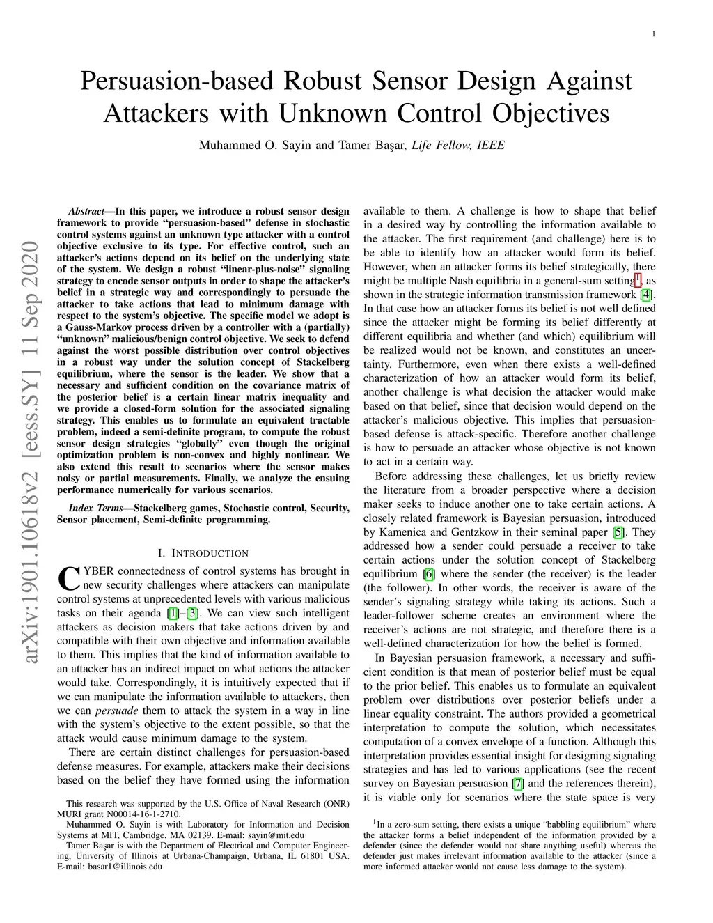 Persuasion-based Robust Sensor Design Against Attackers with Unknown