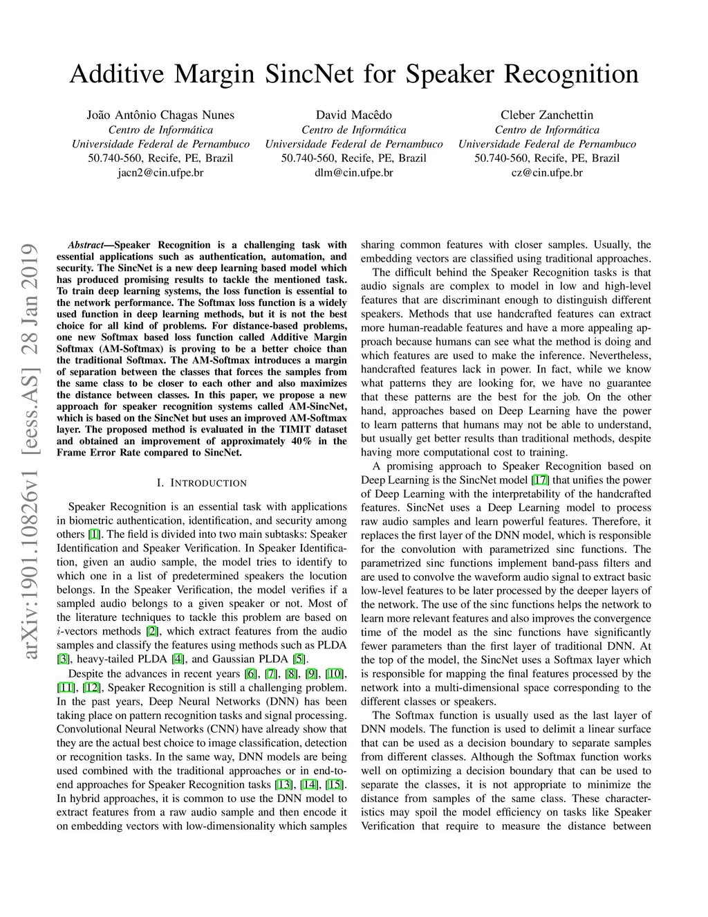 Speaker Recognition is a challenging task with essential applications such as authentication, automation, and security. The SincNet is a new deep learning based model which has produced promising results to tackle the mentioned task. To train deep learning systems, the loss function is essential to the network performance. The Softmax loss function is a widely used function in deep learning methods, but it is not the best choice for all kind of problems. For distance-based problems, one new Softmax based loss function called Additive Margin Softmax (AM-Softmax) is proving to be a better choice than the traditional Softmax. The AM-Softmax introduces a margin of separation between the classes that forces the samples from the same class to be closer to each other and also maximizes the distance between classes. In this paper, we propose a new approach for speaker recognition systems called AM-SincNet, which is based on the SincNet but uses an improved AM-Softmax layer. The proposed method is evaluated in the TIMIT dataset and obtained an improvement of approximately 40% in the Frame Error Rate compared to SincNet.