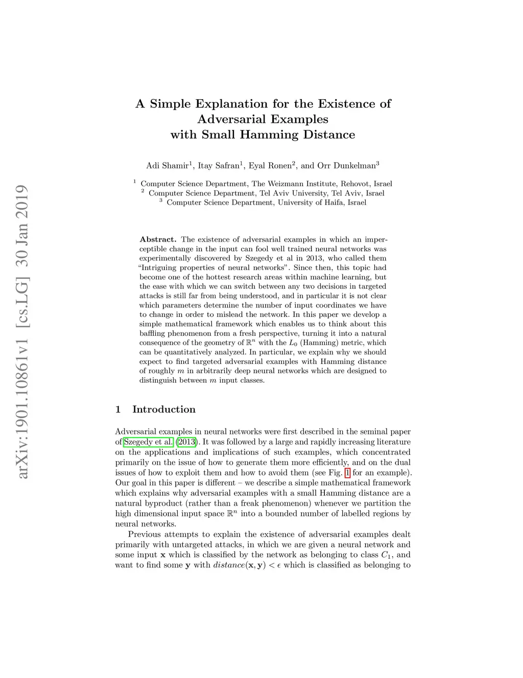 The existence of adversarial examples in which an imperceptible change in the input can fool well trained neural networks was experimentally discovered by Szegedy et al in 2013, who called them "Intriguing properties of neural networks". Since then, this topic had become one of the hottest research areas within machine learning, but the ease with which we can switch between any two decisions in targeted attacks is still far from being understood, and in particular it is not clear which parameters determine the number of input coordinates we have to change in order to mislead the network. In this paper we develop a simple mathematical framework which enables us to think about this baffling phenomenon from a fresh perspective, turning it into a natural consequence of the geometry of with the (Hamming) metric, which can be quantitatively analyzed. In particular, we explain why we should expect to find targeted adversarial examples with Hamming distance of roughly in arbitrarily deep neural networks which are designed to distinguish between input classes.