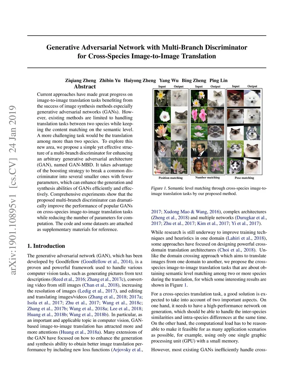 Current approaches have made great progress on image-to-image translation tasks benefiting from the success of image synthesis methods especially generative adversarial networks (GANs). However, existing methods are limited to handling translation tasks between two species while keeping the content matching on the semantic level. A more challenging task would be the translation among more than two species. To explore this new area, we propose a simple yet effective structure of a multi-branch discriminator for enhancing an arbitrary generative adversarial architecture (GAN), named GAN-MBD. It takes advantage of the boosting strategy to break a common discriminator into several smaller ones with fewer parameters, which can enhance the generation and synthesis abilities of GANs efficiently and effectively. Comprehensive experiments show that the proposed multi-branch discriminator can dramatically improve the performance of popular GANs on cross-species image-to-image translation tasks while reducing the number of parameters for computation. The code and some datasets are attached as supplementary materials for reference.