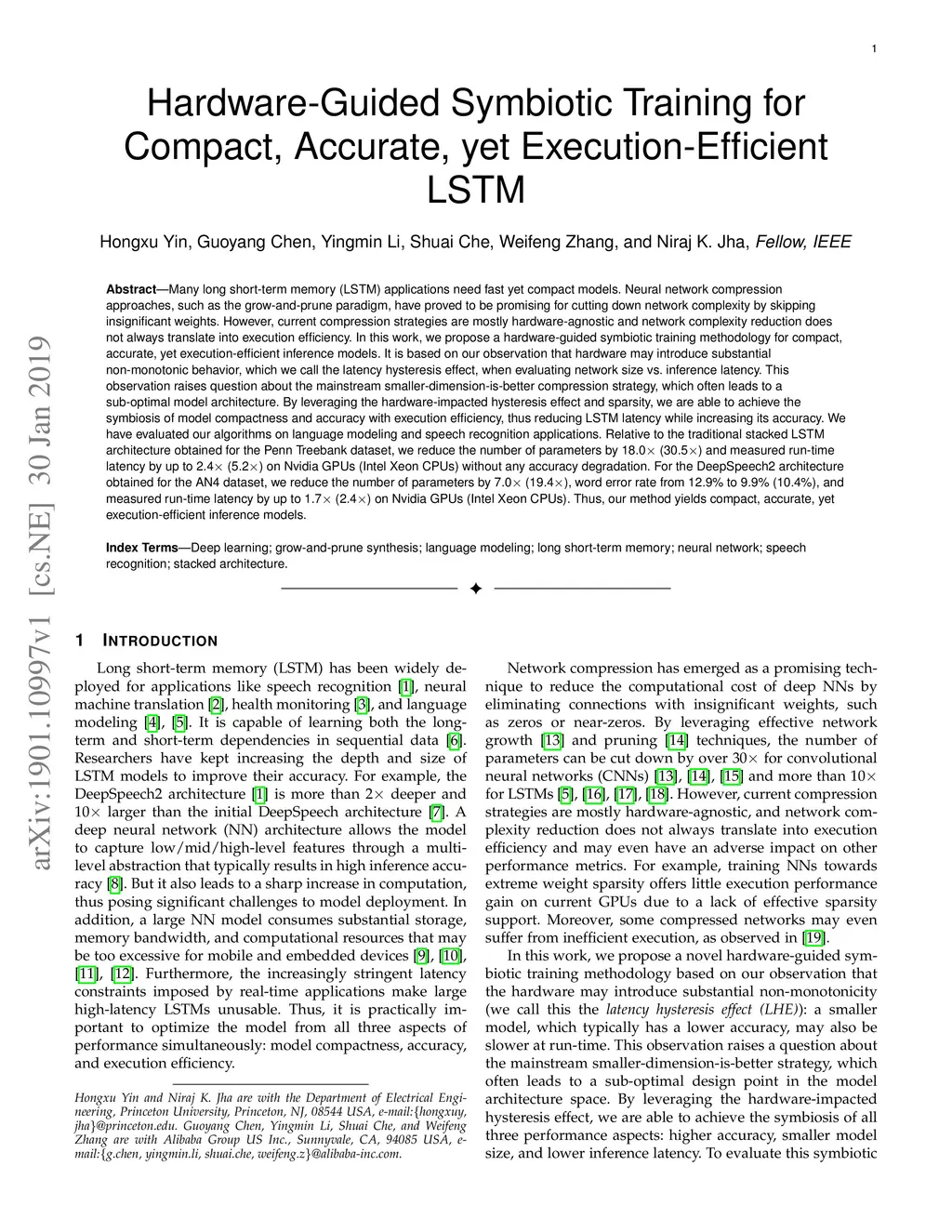Many long short-term memory (LSTM) applications need fast yet compact models. Neural network compression approaches, such as the grow-and-prune paradigm, have proved to be promising for cutting down network complexity by skipping insignificant weights. However, current compression strategies are mostly hardware-agnostic and network complexity reduction does not always translate into execution efficiency. In this work, we propose a hardware-guided symbiotic training methodology for compact, accurate, yet execution-efficient inference models. It is based on our observation that hardware may introduce substantial non-monotonic behavior, which we call the latency hysteresis effect, when evaluating network size vs. inference latency. This observation raises question about the mainstream smaller-dimension-is-better compression strategy, which often leads to a sub-optimal model architecture. By leveraging the hardware-impacted hysteresis effect and sparsity, we are able to achieve the symbiosis of model compactness and accuracy with execution efficiency, thus reducing LSTM latency while increasing its accuracy. We have evaluated our algorithms on language modeling and speech recognition applications. Relative to the traditional stacked LSTM architecture obtained for the Penn Treebank dataset, we reduce the number of parameters by 18.0x (30.5x) and measured run-time latency by up to 2.4x (5.2x) on Nvidia GPUs (Intel Xeon CPUs) without any accuracy degradation. For the DeepSpeech2 architecture obtained for the AN4 dataset, we reduce the number of parameters by 7.0x (19.4x), word error rate from 12.9% to 9.9% (10.4%), and measured run-time latency by up to 1.7x (2.4x) on Nvidia GPUs (Intel Xeon CPUs). Thus, our method yields compact, accurate, yet execution-efficient inference models.