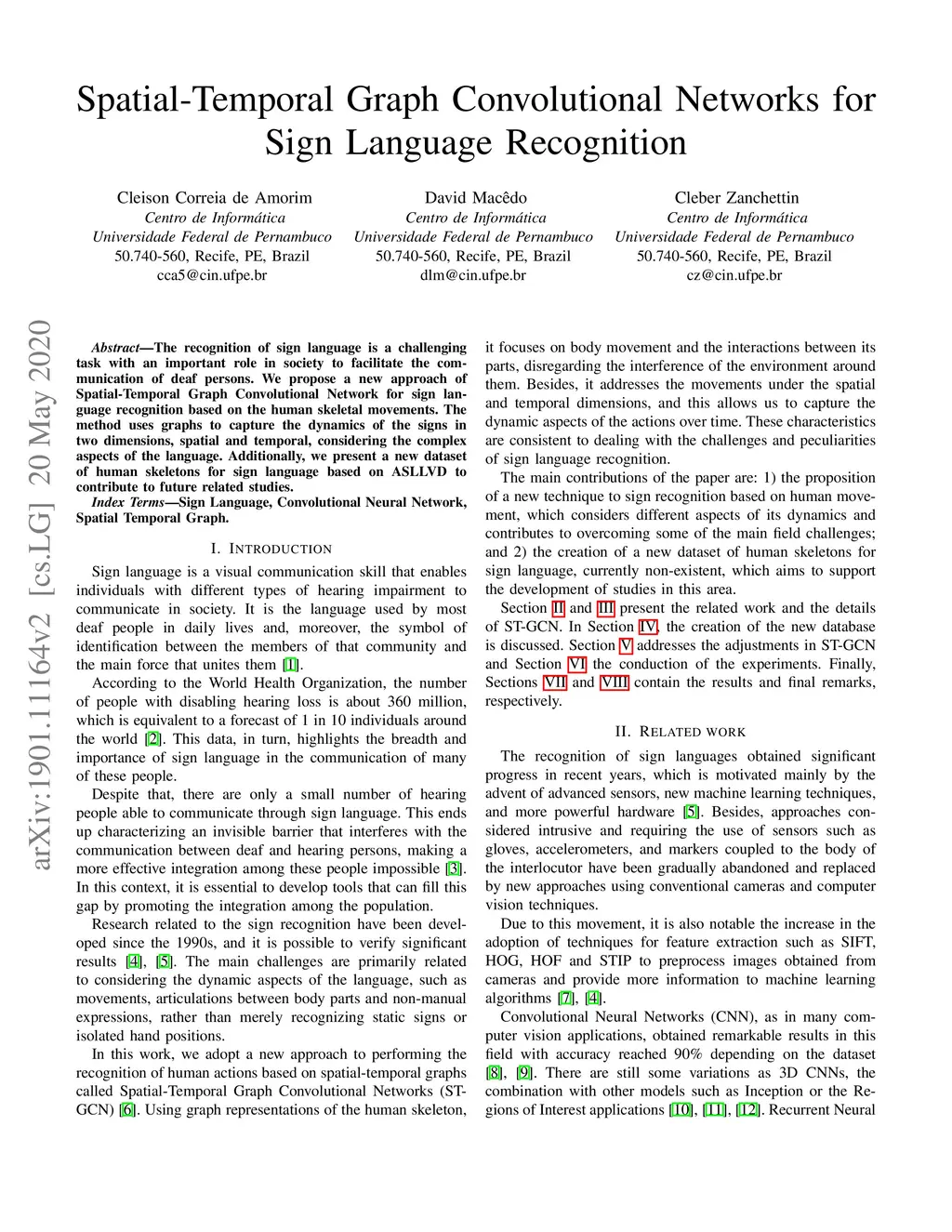 The recognition of sign language is a challenging task with an important role in society to facilitate the communication of deaf persons. We propose a new approach of Spatial-Temporal Graph Convolutional Network to sign language recognition based on the human skeletal movements. The method uses graphs to capture the signs dynamics in two dimensions, spatial and temporal, considering the complex aspects of the language. Additionally, we present a new dataset of human skeletons for sign language based on ASLLVD to contribute to future related studies.