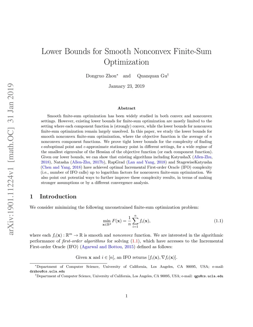 Smooth finite-sum optimization has been widely studied in both convex and nonconvex settings. However, existing lower bounds for finite-sum optimization are mostly limited to the setting where each component function is (strongly) convex, while the lower bounds for nonconvex finite-sum optimization remain largely unsolved. In this paper, we study the lower bounds for smooth nonconvex finite-sum optimization, where the objective function is the average of nonconvex component functions. We prove tight lower bounds for the complexity of finding -suboptimal point and -approximate stationary point in different settings, for a wide regime of the smallest eigenvalue of the Hessian of the objective function (or each component function). Given our lower bounds, we can show that existing algorithms including KatyushaX (Allen-Zhu, 2018), Natasha (Allen-Zhu, 2017), RapGrad (Lan and Yang, 2018) and StagewiseKatyusha (Chen and Yang, 2018) have achieved optimal Incremental First-order Oracle (IFO) complexity (i.e., number of IFO calls) up to logarithm factors for nonconvex finite-sum optimization. We also point out potential ways to further improve these complexity results, in terms of making stronger assumptions or by a different convergence analysis.