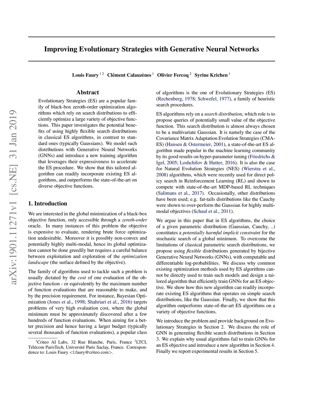Evolutionary Strategies (ES) are a popular family of black-box zeroth-order optimization algorithms which rely on search distributions to efficiently optimize a large variety of objective functions. This paper investigates the potential benefits of using highly flexible search distributions in classical ES algorithms, in contrast to standard ones (typically Gaussians). We model such distributions with Generative Neural Networks (GNNs) and introduce a new training algorithm that leverages their expressiveness to accelerate the ES procedure. We show that this tailored algorithm can readily incorporate existing ES algorithms, and outperforms the state-of-the-art on diverse objective functions.