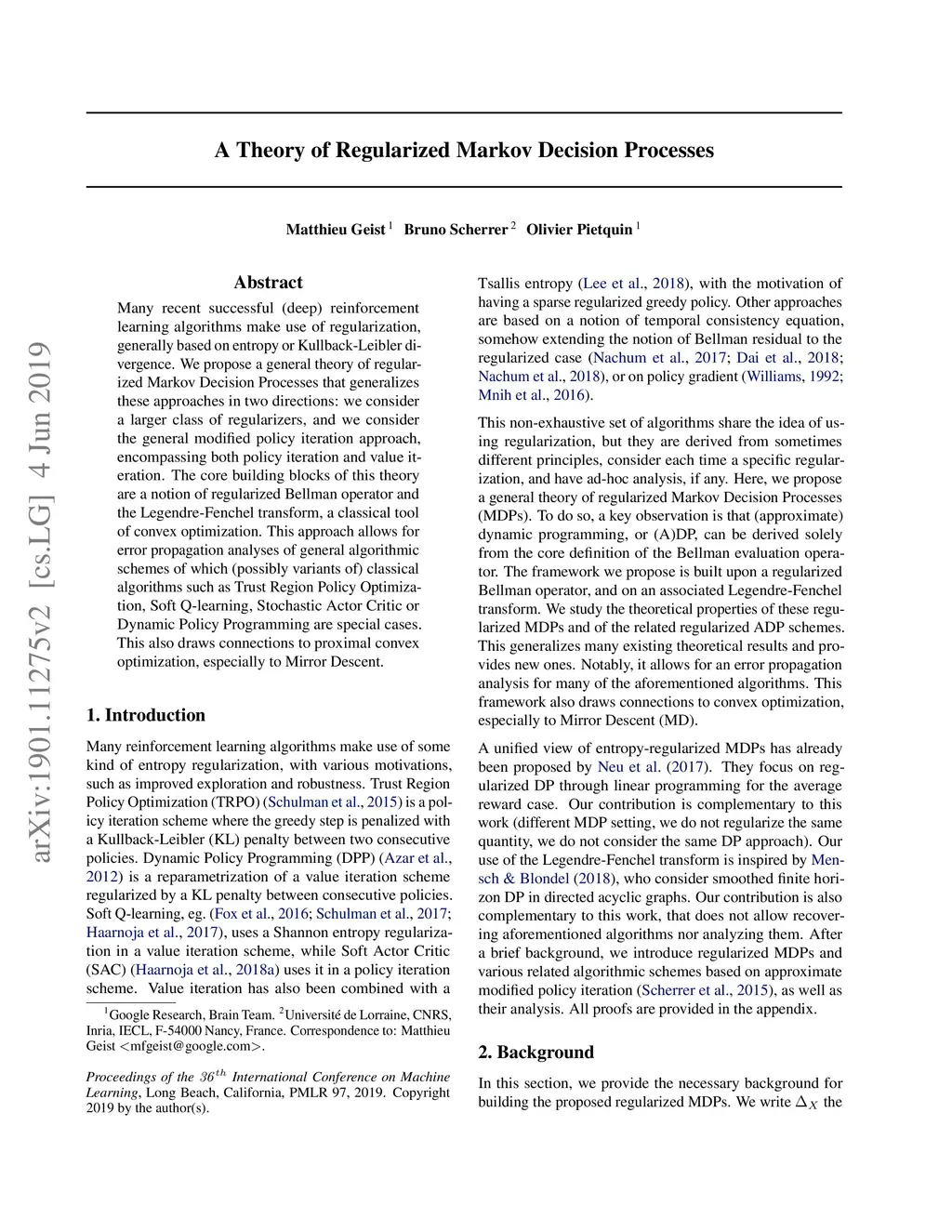Many recent successful (deep) reinforcement learning algorithms make use of regularization, generally based on entropy or Kullback-Leibler divergence. We propose a general theory of regularized Markov Decision Processes that generalizes these approaches in two directions: we consider a larger class of regularizers, and we consider the general modified policy iteration approach, encompassing both policy iteration and value iteration. The core building blocks of this theory are a notion of regularized Bellman operator and the Legendre-Fenchel transform, a classical tool of convex optimization. This approach allows for error propagation analyses of general algorithmic schemes of which (possibly variants of) classical algorithms such as Trust Region Policy Optimization, Soft Q-learning, Stochastic Actor Critic or Dynamic Policy Programming are special cases. This also draws connections to proximal convex optimization, especially to Mirror Descent.