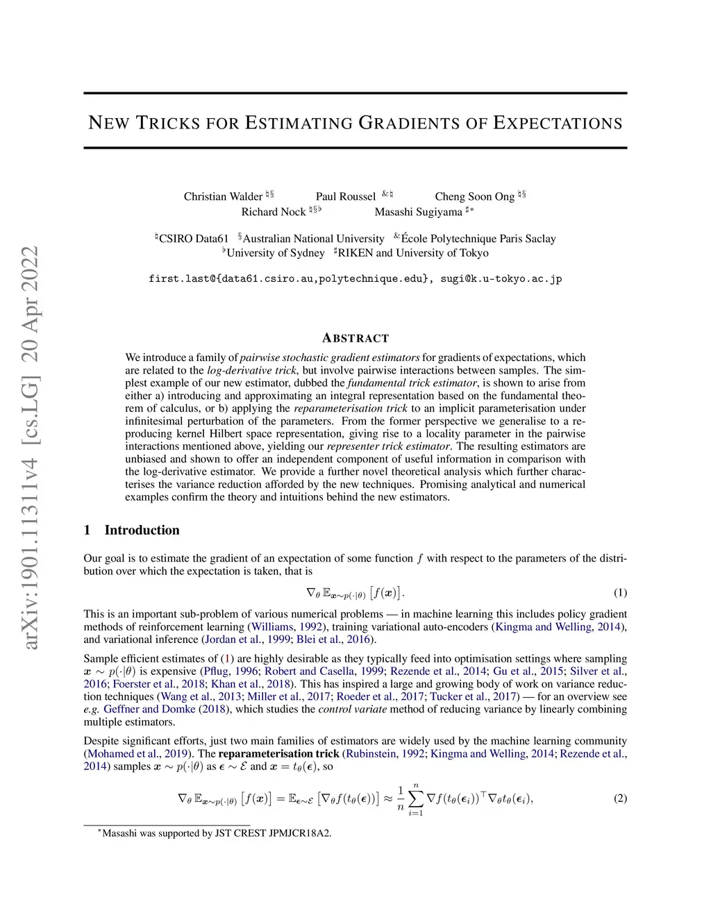 We introduce a family of pairwise stochastic gradient estimators for gradients of expectations, which are related to the log-derivative trick, but involve pairwise interactions between samples. The simplest example of our new estimator, dubbed the fundamental trick estimator, is shown to arise from either a) introducing and approximating an integral representation based on the fundamental theorem of calculus, or b) applying the reparameterisation trick to an implicit parameterisation under infinitesimal perturbation of the parameters. From the former perspective we generalise to a reproducing kernel Hilbert space representation, giving rise to a locality parameter in the pairwise interactions mentioned above, yielding our representer trick estimator. The resulting estimators are unbiased and shown to offer an independent component of useful information in comparison with the log-derivative estimator. We provide a further novel theoretical analysis which further characterises the variance reduction afforded by the new techniques. Promising analytical and numerical examples confirm the theory and intuitions behind the new estimators.