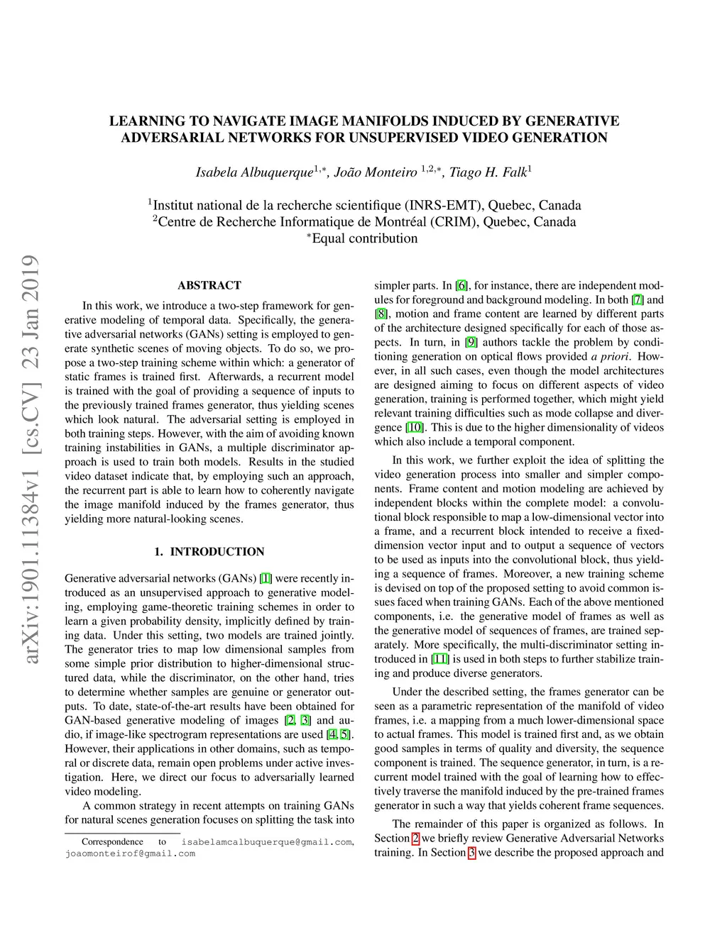 In this work, we introduce a two-step framework for generative modeling of temporal data. Specifically, the generative adversarial networks (GANs) setting is employed to generate synthetic scenes of moving objects. To do so, we propose a two-step training scheme within which: a generator of static frames is trained first. Afterwards, a recurrent model is trained with the goal of providing a sequence of inputs to the previously trained frames generator, thus yielding scenes which look natural. The adversarial setting is employed in both training steps. However, with the aim of avoiding known training instabilities in GANs, a multiple discriminator approach is used to train both models. Results in the studied video dataset indicate that, by employing such an approach, the recurrent part is able to learn how to coherently navigate the image manifold induced by the frames generator, thus yielding more natural-looking scenes.