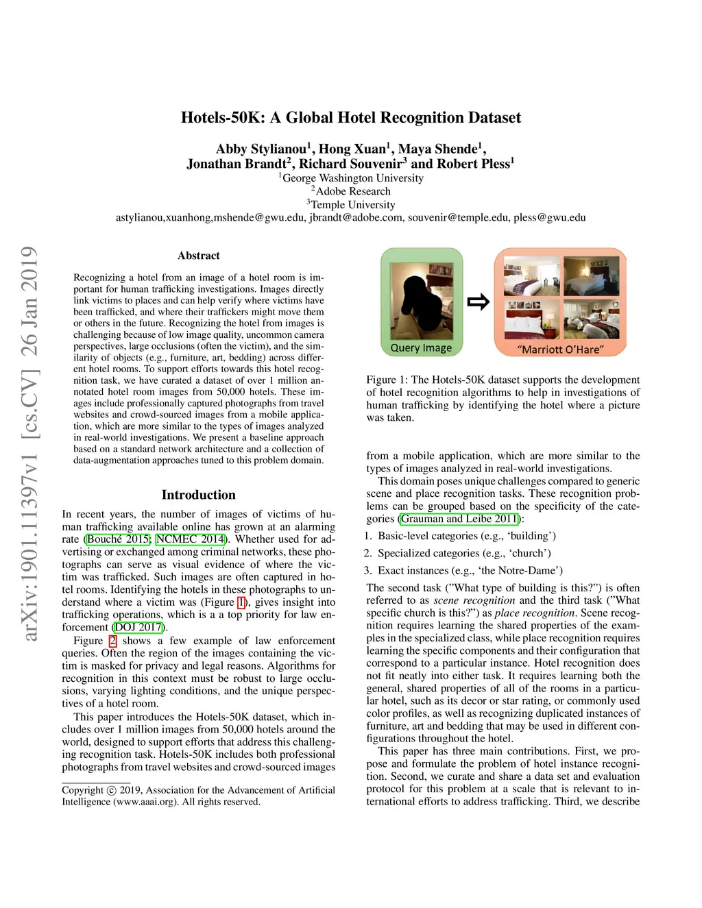 Recognizing a hotel from an image of a hotel room is important for human trafficking investigations. Images directly link victims to places and can help verify where victims have been trafficked, and where their traffickers might move them or others in the future. Recognizing the hotel from images is challenging because of low image quality, uncommon camera perspectives, large occlusions (often the victim), and the similarity of objects (e.g., furniture, art, bedding) across different hotel rooms. To support efforts towards this hotel recognition task, we have curated a dataset of over 1 million annotated hotel room images from 50,000 hotels. These images include professionally captured photographs from travel websites and crowd-sourced images from a mobile application, which are more similar to the types of images analyzed in real-world investigations. We present a baseline approach based on a standard network architecture and a collection of data-augmentation approaches tuned to this problem domain.