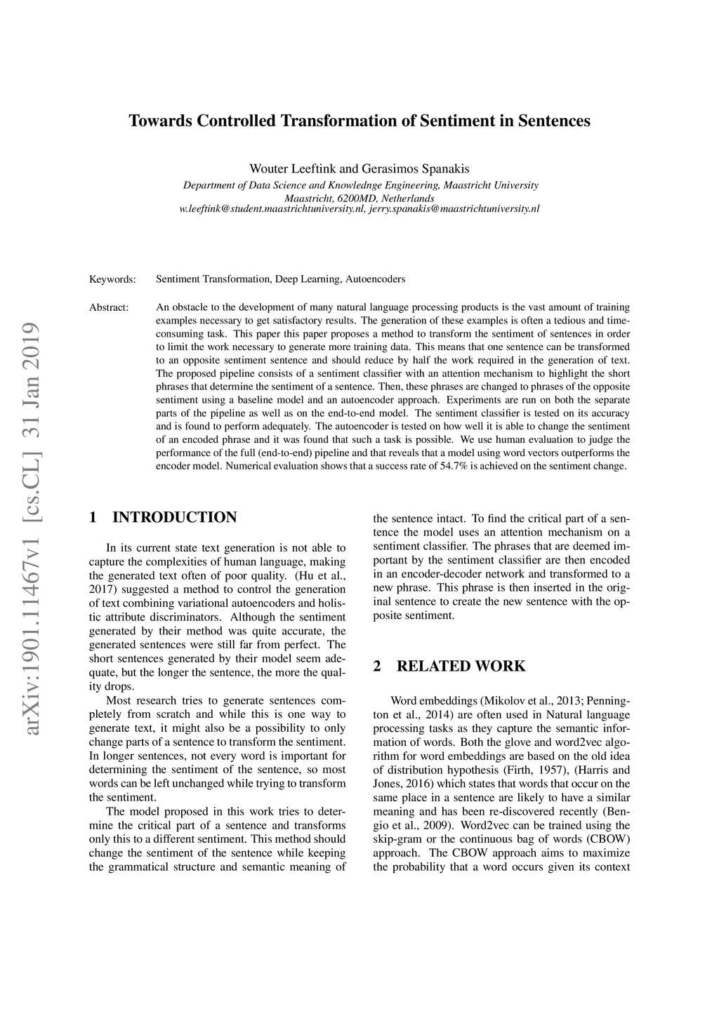 An obstacle to the development of many natural language processing products is the vast amount of training examples necessary to get satisfactory results. The generation of these examples is often a tedious and time-consuming task. This paper this paper proposes a method to transform the sentiment of sentences in order to limit the work necessary to generate more training data. This means that one sentence can be transformed to an opposite sentiment sentence and should reduce by half the work required in the generation of text. The proposed pipeline consists of a sentiment classifier with an attention mechanism to highlight the short phrases that determine the sentiment of a sentence. Then, these phrases are changed to phrases of the opposite sentiment using a baseline model and an autoencoder approach. Experiments are run on both the separate parts of the pipeline as well as on the end-to-end model. The sentiment classifier is tested on its accuracy and is found to perform adequately. The autoencoder is tested on how well it is able to change the sentiment of an encoded phrase and it was found that such a task is possible. We use human evaluation to judge the performance of the full (end-to-end) pipeline and that reveals that a model using word vectors outperforms the encoder model. Numerical evaluation shows that a success rate of 54.7% is achieved on the sentiment change.