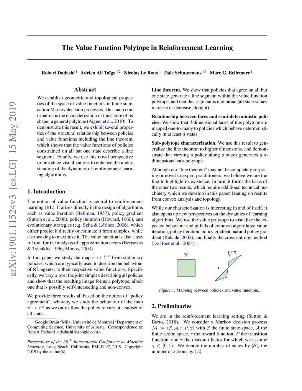 We establish geometric and topological properties of the space of value functions in finite state-action Markov decision processes. Our main contribution is the characterization of the nature of its shape: a general polytope (Aigner et al., 2010). To demonstrate this result, we exhibit several properties of the structural relationship between policies and value functions including the line theorem, which shows that the value functions of policies constrained on all but one state describe a line segment. Finally, we use this novel perspective to introduce visualizations to enhance the understanding of the dynamics of reinforcement learning algorithms.