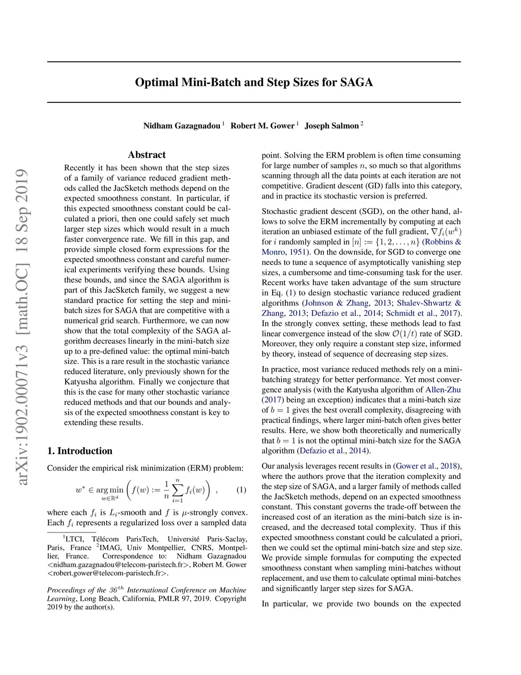 Recently it has been shown that the step sizes of a family of variance reduced gradient methods called the JacSketch methods depend on the expected smoothness constant. In particular, if this expected smoothness constant could be calculated a priori, then one could safely set much larger step sizes which would result in a much faster convergence rate. We fill in this gap, and provide simple closed form expressions for the expected smoothness constant and careful numerical experiments verifying these bounds. Using these bounds, and since the SAGA algorithm is part of this JacSketch family, we suggest a new standard practice for setting the step sizes and mini-batch size for SAGA that are competitive with a numerical grid search. Furthermore, we can now show that the total complexity of the SAGA algorithm decreases linearly in the mini-batch size up to a pre-defined value: the optimal mini-batch size. This is a rare result in the stochastic variance reduced literature, only previously shown for the Katyusha algorithm. Finally we conjecture that this is the case for many other stochastic variance reduced methods and that our bounds and analysis of the expected smoothness constant is key to extending these results.