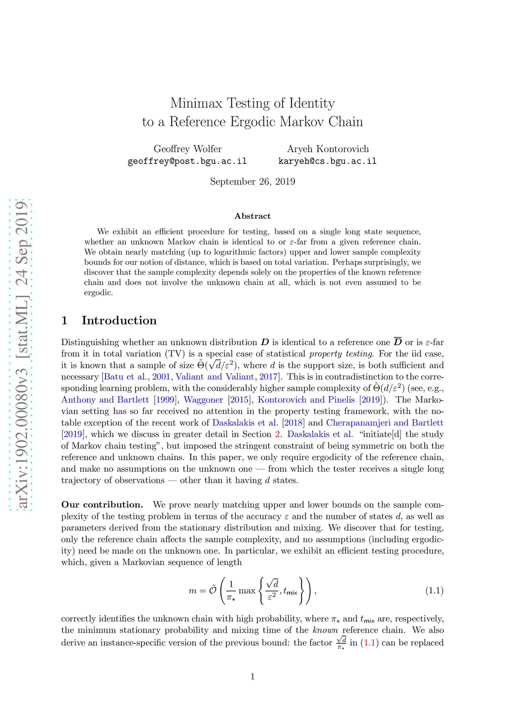 We exhibit an efficient procedure for testing, based on a single long state sequence, whether an unknown Markov chain is identical to or -far from a given reference chain. We obtain nearly matching (up to logarithmic factors) upper and lower sample complexity bounds for our notion of distance, which is based on total variation. Perhaps surprisingly, we discover that the sample complexity depends solely on the properties of the known reference chain and does not involve the unknown chain at all, which is not even assumed to be ergodic.