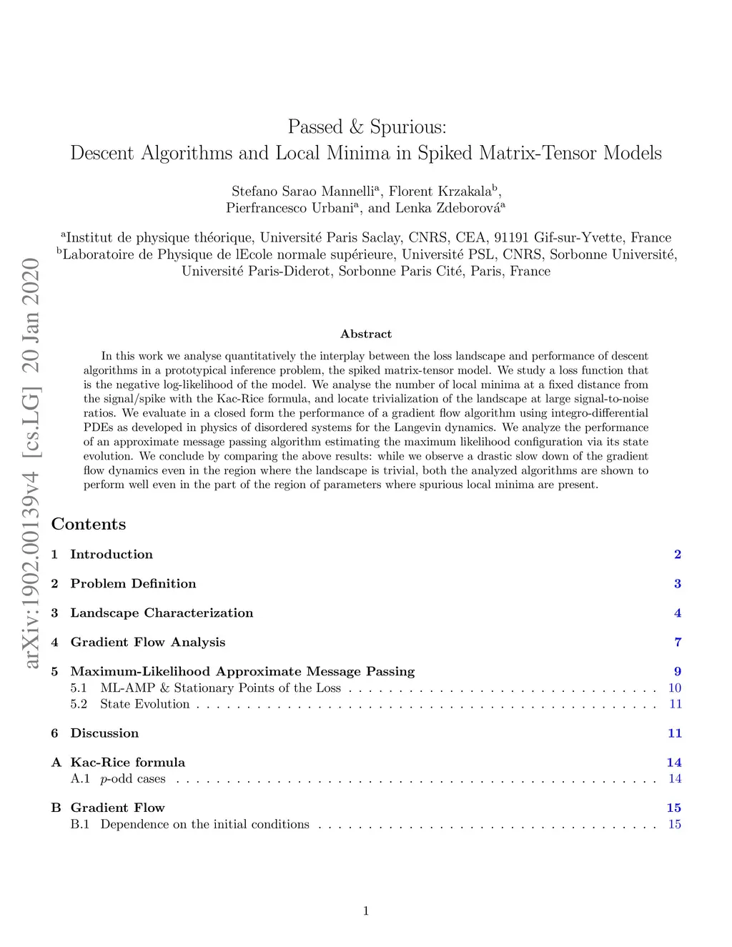 In this work we analyse quantitatively the interplay between the loss landscape and performance of descent algorithms in a prototypical inference problem, the spiked matrix-tensor model. We study a loss function that is the negative log-likelihood of the model. We analyse the number of local minima at a fixed distance from the signal/spike with the Kac-Rice formula, and locate trivialization of the landscape at large signal-to-noise ratios. We evaluate in a closed form the performance of a gradient flow algorithm using integro-differential PDEs as developed in physics of disordered systems for the Langevin dynamics. We analyze the performance of an approximate message passing algorithm estimating the maximum likelihood configuration via its state evolution. We conclude by comparing the above results: while we observe a drastic slow down of the gradient flow dynamics even in the region where the landscape is trivial, both the analyzed algorithms are shown to perform well even in the part of the region of parameters where spurious local minima are present.