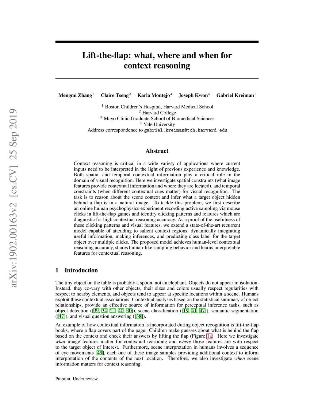 Context reasoning is critical in a wide variety of applications where current inputs need to be interpreted in the light of previous experience and knowledge. Both spatial and temporal contextual information play a critical role in the domain of visual recognition. Here we investigate spatial constraints (what image features provide contextual information and where they are located), and temporal constraints (when different contextual cues matter) for visual recognition. The task is to reason about the scene context and infer what a target object hidden behind a flap is in a natural image. To tackle this problem, we first describe an online human psychophysics experiment recording active sampling via mouse clicks in lift-the-flap games and identify clicking patterns and features which are diagnostic for high contextual reasoning accuracy. As a proof of the usefulness of these clicking patterns and visual features, we extend a state-of-the-art recurrent model capable of attending to salient context regions, dynamically integrating useful information, making inferences, and predicting class label for the target object over multiple clicks. The proposed model achieves human-level contextual reasoning accuracy, shares human-like sampling behavior and learns interpretable features for contextual reasoning.