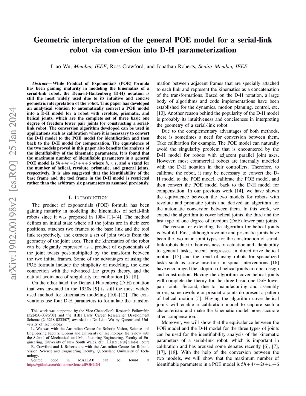 While Product of Exponentials (POE) formula has been gaining increasing popularity in modeling the kinematics of a serial-link robot, the Denavit-Hartenberg (D-H) notation is still the most widely used due to its intuitive and concise geometric interpretation of the robot. This paper has developed an analytical solution to automatically convert a POE model into a D-H model for a robot with revolute, prismatic, and helical joints, which are the complete set of three basic one degree of freedom lower pair joints for constructing a serial-link robot. The conversion algorithm developed can be used in applications such as calibration where it is necessary to convert the D-H model to the POE model for identification and then back to the D-H model for compensation. The equivalence of the two models proved in this paper also benefits the analysis of the identifiability of the kinematic parameters. It is found that the maximum number of identifiable parameters in a general POE model is 5h+4r +2t +n+6 where h, r, t, and n stand for the number of helical, revolute, prismatic, and general joints, respectively. It is also suggested that the identifiability of the base frame and the tool frame in the D-H model is restricted rather than the arbitrary six parameters as assumed previously.