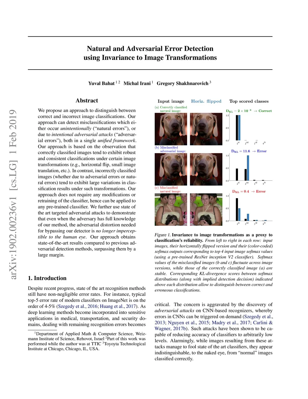 We propose an approach to distinguish between correct and incorrect image classifications. Our approach can detect misclassifications which either occur ("natural errors"), or due to ("adversarial errors"), both in a single . Our approach is based on the observation that correctly classified images tend to exhibit robust and consistent classifications under certain image transformations (e.g., horizontal flip, small image translation, etc.). In contrast, incorrectly classified images (whether due to adversarial errors or natural errors) tend to exhibit large variations in classification results under such transformations. Our approach does not require any modifications or retraining of the classifier, hence can be applied to any pre-trained classifier. We further use state of the art targeted adversarial attacks to demonstrate that even when the adversary has full knowledge of our method, the adversarial distortion needed for bypassing our detector is . Our approach obtains state-of-the-art results compared to previous adversarial detection methods, surpassing them by a large margin.