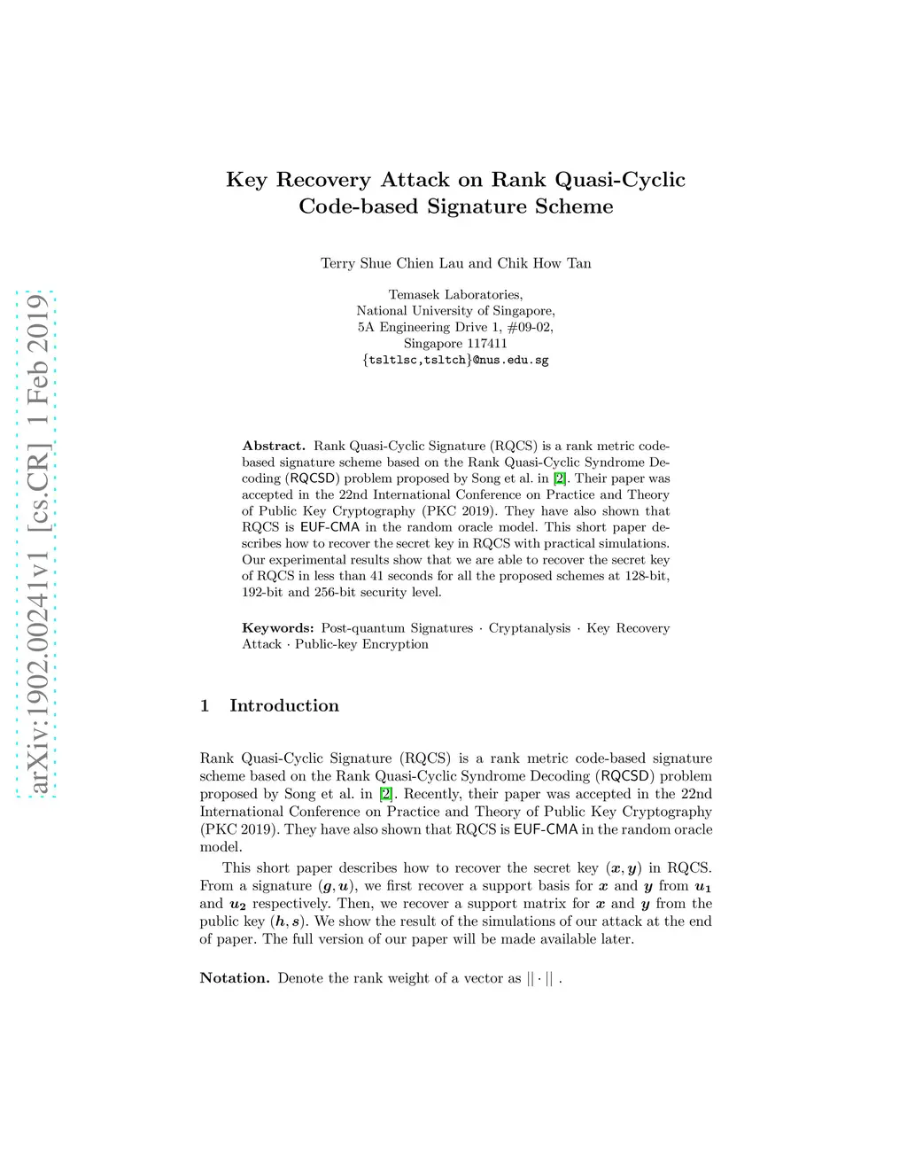 Rank Quasi-Cyclic Signature (RQCS) is a rank metric code-based signature scheme based on the Rank Quasi-Cyclic Syndrome Decoding (RQCSD) problem proposed by Song et al. in [2]. Their paper was accepted in the 22nd International Conference on Practice and Theory of Public Key Cryptography (PKC 2019). They have also shown that RQCS is EUF-CMA in the random oracle model. This short paper describes how to recover the secret key in RQCS with practical simulations. Our experimental results show that we are able to recover the secret key of RQCS in less than 41 seconds for all the proposed schemes at 128-bit, 192-bit and 256-bit security level.