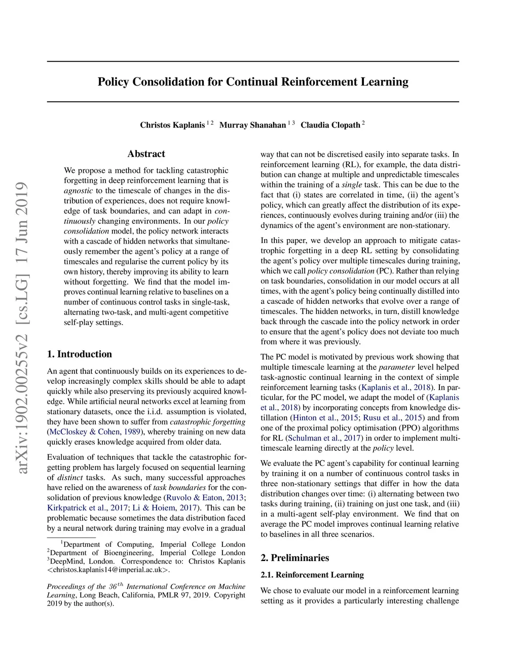 We propose a method for tackling catastrophic forgetting in deep reinforcement learning that is \textit{agnostic} to the timescale of changes in the distribution of experiences, does not require knowledge of task boundaries, and can adapt in \textit{continuously} changing environments. In our \textit{policy consolidation} model, the policy network interacts with a cascade of hidden networks that simultaneously remember the agent's policy at a range of timescales and regularise the current policy by its own history, thereby improving its ability to learn without forgetting. We find that the model improves continual learning relative to baselines on a number of continuous control tasks in single-task, alternating two-task, and multi-agent competitive self-play settings.