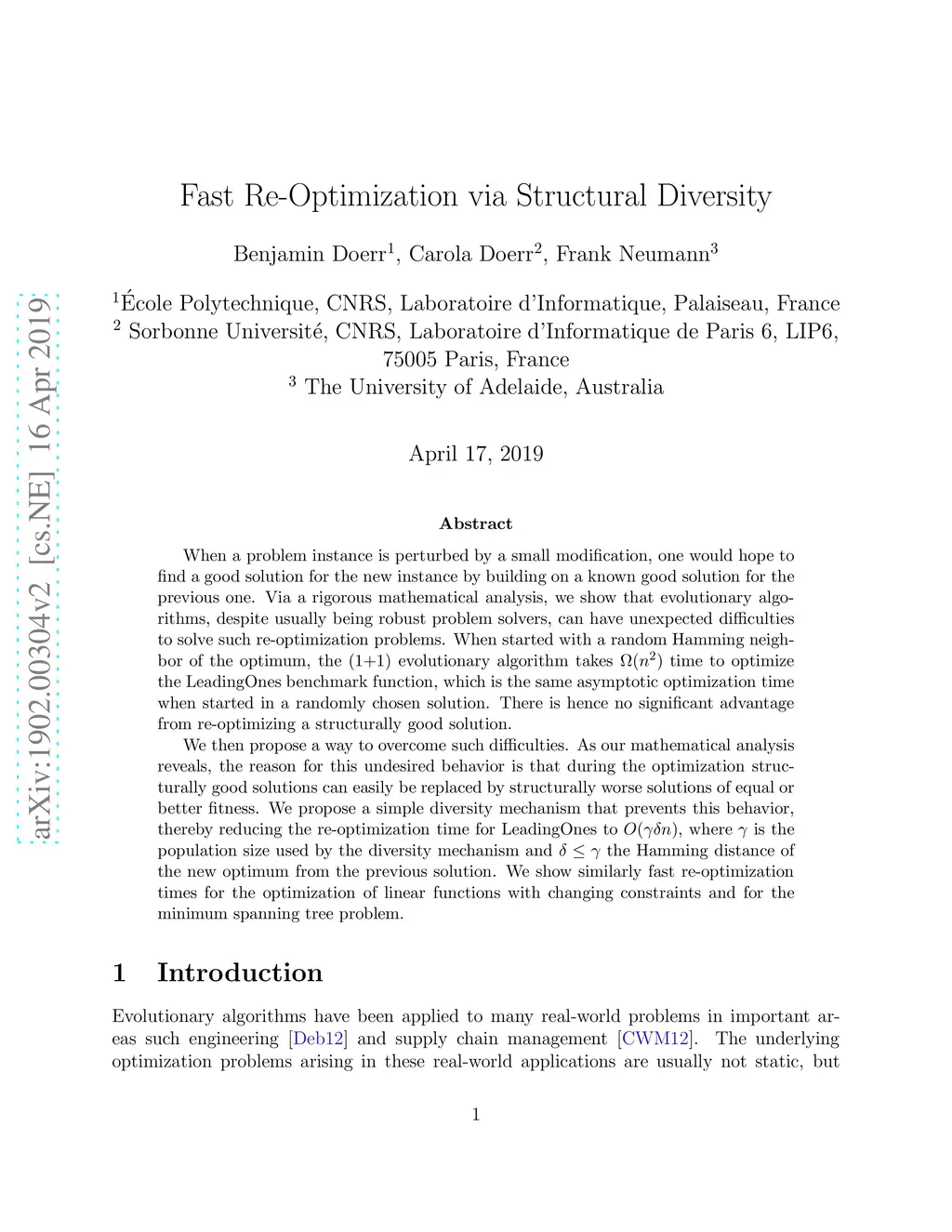 When a problem instance is perturbed by a small modification, one would hope to find a good solution for the new instance by building on a known good solution for the previous one. Via a rigorous mathematical analysis, we show that evolutionary algorithms, despite usually being robust problem solvers, can have unexpected difficulties to solve such re-optimization problems. When started with a random Hamming neighbor of the optimum, the (1+1) evolutionary algorithm takes time to optimize the LeadingOnes benchmark function, which is the same asymptotic optimization time when started in a randomly chosen solution. There is hence no significant advantage from re-optimizing a structurally good solution. We then propose a way to overcome such difficulties. As our mathematical analysis reveals, the reason for this undesired behavior is that during the optimization structurally good solutions can easily be replaced by structurally worse solutions of equal or better fitness. We propose a simple diversity mechanism that prevents this behavior, thereby reducing the re-optimization time for LeadingOnes to , where is the population size used by the diversity mechanism and the Hamming distance of the new optimum from the previous solution. We show similarly fast re-optimization times for the optimization of linear functions with changing constraints and for the minimum spanning tree problem.
