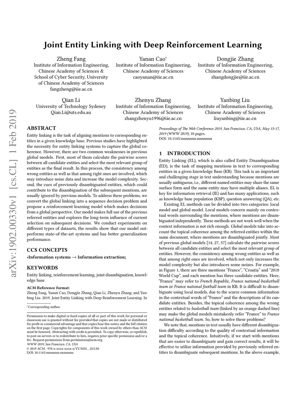 Entity linking is the task of aligning mentions to corresponding entities in a given knowledge base. Previous studies have highlighted the necessity for entity linking systems to capture the global coherence. However, there are two common weaknesses in previous global models. First, most of them calculate the pairwise scores between all candidate entities and select the most relevant group of entities as the final result. In this process, the consistency among wrong entities as well as that among right ones are involved, which may introduce noise data and increase the model complexity. Second, the cues of previously disambiguated entities, which could contribute to the disambiguation of the subsequent mentions, are usually ignored by previous models. To address these problems, we convert the global linking into a sequence decision problem and propose a reinforcement learning model which makes decisions from a global perspective. Our model makes full use of the previous referred entities and explores the long-term influence of current selection on subsequent decisions. We conduct experiments on different types of datasets, the results show that our model outperforms state-of-the-art systems and has better generalization performance.
