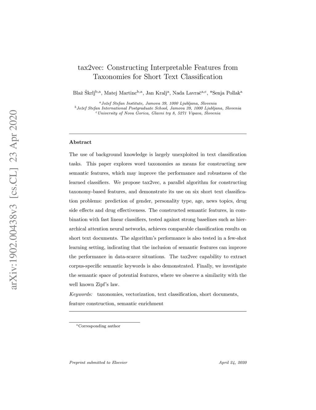The use of background knowledge is largely unexploited in text classification tasks. This paper explores word taxonomies as means for constructing new semantic features, which may improve the performance and robustness of the learned classifiers. We propose tax2vec, a parallel algorithm for constructing taxonomy-based features, and demonstrate its use on six short text classification problems: prediction of gender, personality type, age, news topics, drug side effects and drug effectiveness. The constructed semantic features, in combination with fast linear classifiers, tested against strong baselines such as hierarchical attention neural networks, achieves comparable classification results on short text documents. The algorithm's performance is also tested in a few-shot learning setting, indicating that the inclusion of semantic features can improve the performance in data-scarce situations. The tax2vec capability to extract corpus-specific semantic keywords is also demonstrated. Finally, we investigate the semantic space of potential features, where we observe a similarity with the well known Zipf's law.