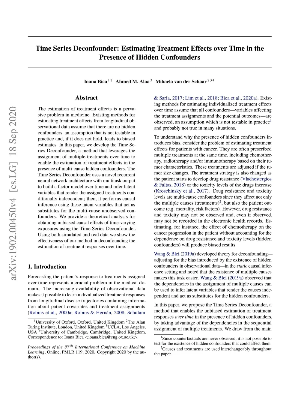 The estimation of treatment effects is a pervasive problem in medicine. Existing methods for estimating treatment effects from longitudinal observational data assume that there are no hidden confounders, an assumption that is not testable in practice and, if it does not hold, leads to biased estimates. In this paper, we develop the Time Series Deconfounder, a method that leverages the assignment of multiple treatments over time to enable the estimation of treatment effects in the presence of multi-cause hidden confounders. The Time Series Deconfounder uses a novel recurrent neural network architecture with multitask output to build a factor model over time and infer latent variables that render the assigned treatments conditionally independent; then, it performs causal inference using these latent variables that act as substitutes for the multi-cause unobserved confounders. We provide a theoretical analysis for obtaining unbiased causal effects of time-varying exposures using the Time Series Deconfounder. Using both simulated and real data we show the effectiveness of our method in deconfounding the estimation of treatment responses over time.