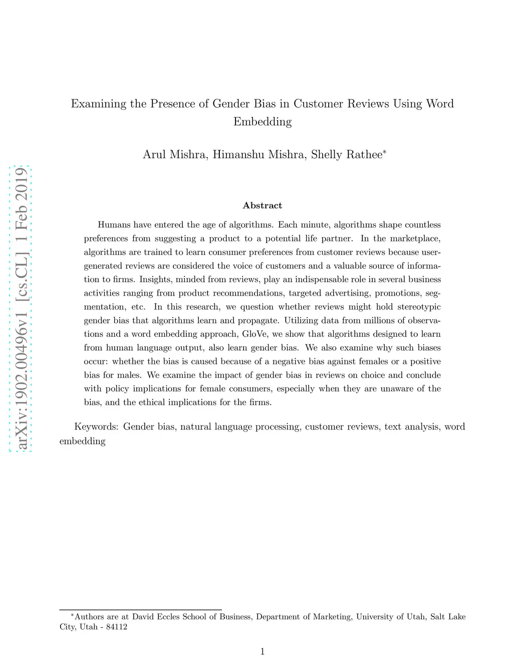 Humans have entered the age of algorithms. Each minute, algorithms shape countless preferences from suggesting a product to a potential life partner. In the marketplace algorithms are trained to learn consumer preferences from customer reviews because user-generated reviews are considered the voice of customers and a valuable source of information to firms. Insights mined from reviews play an indispensable role in several business activities ranging from product recommendation, targeted advertising, promotions, segmentation etc. In this research, we question whether reviews might hold stereotypic gender bias that algorithms learn and propagate Utilizing data from millions of observations and a word embedding approach, GloVe, we show that algorithms designed to learn from human language output also learn gender bias. We also examine why such biases occur: whether the bias is caused because of a negative bias against females or a positive bias for males. We examine the impact of gender bias in reviews on choice and conclude with policy implications for female consumers, especially when they are unaware of the bias, and the ethical implications for firms.