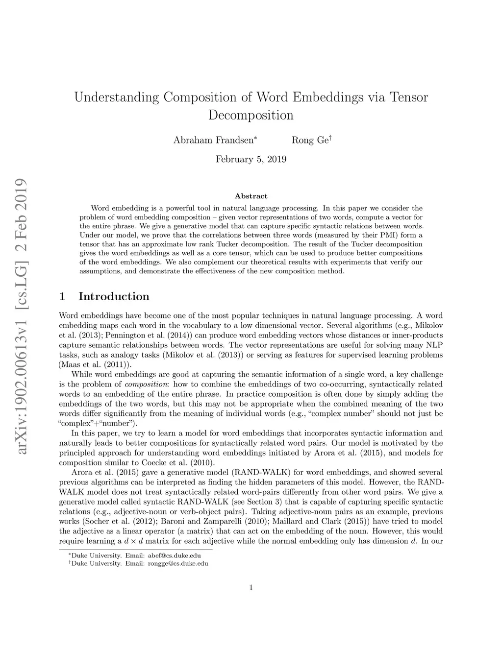 Word embedding is a powerful tool in natural language processing. In this paper we consider the problem of word embedding composition \--- given vector representations of two words, compute a vector for the entire phrase. We give a generative model that can capture specific syntactic relations between words. Under our model, we prove that the correlations between three words (measured by their PMI) form a tensor that has an approximate low rank Tucker decomposition. The result of the Tucker decomposition gives the word embeddings as well as a core tensor, which can be used to produce better compositions of the word embeddings. We also complement our theoretical results with experiments that verify our assumptions, and demonstrate the effectiveness of the new composition method.