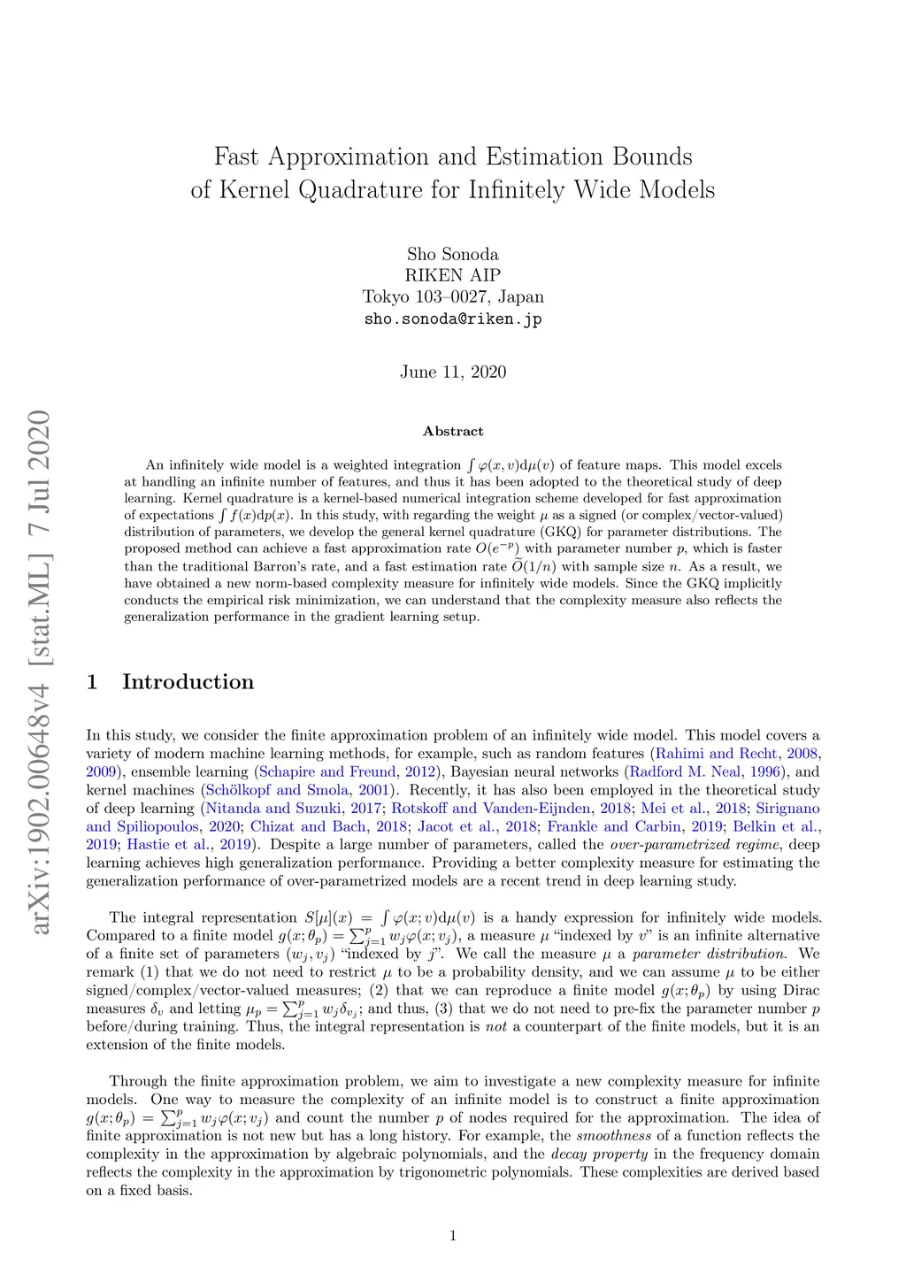 An infinitely wide model is a weighted integration of feature maps. This model excels at handling an infinite number of features, and thus it has been adopted to the theoretical study of deep learning. Kernel quadrature is a kernel-based numerical integration scheme developed for fast approximation of expectations . In this study, regarding the weight as a signed (or complex/vector-valued) distribution of parameters, we develop the general kernel quadrature (GKQ) for parameter distributions. The proposed method can achieve a fast approximation rate with parameter number , which is faster than the traditional Barron's rate, and a fast estimation rate with sample size . As a result, we have obtained a new norm-based complexity measure for infinitely wide models. Since the GKQ implicitly conducts the empirical risk minimization, we can understand that the complexity measure also reflects the generalization performance in the gradient learning setup.
