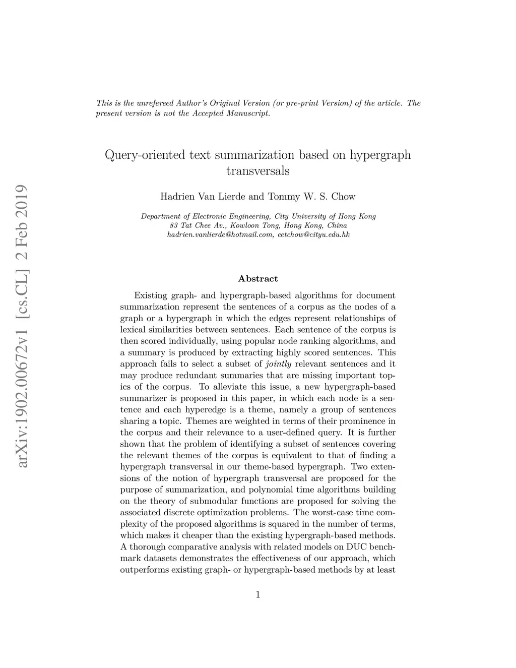 Query-oriented text summarization based on hypergraph transversals
