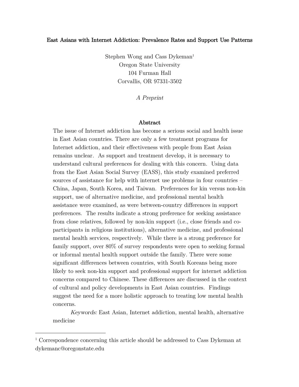 East Asians with Internet Addiction: Prevalence Rates and Support Use