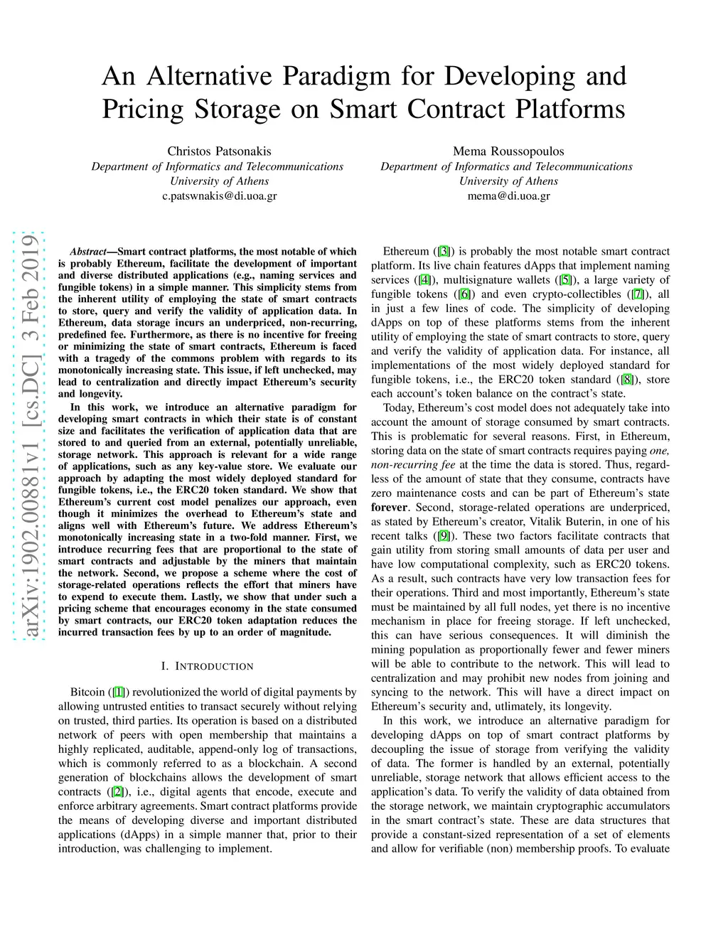 Smart contract platforms facilitate the development of important and diverse distributed applications in a simple manner. This simplicity stems from the inherent utility of employing the state of smart contracts to store, query and verify the validity of application data. In Ethereum, data storage incurs an underpriced, non-recurring, predefined fee. Furthermore, as there is no incentive for freeing or minimizing the state of smart contracts, Ethereum is faced with a tragedy of the commons problem with regards to its monotonically increasing state. This issue, if left unchecked, may lead to centralization and directly impact Ethereum's security and longevity. In this work, we introduce an alternative paradigm for developing smart contracts in which their state is of constant size and facilitates the verification of application data that are stored to and queried from an external, potentially unreliable, storage network. This approach is relevant for a wide range of applications, such as any key-value store. We evaluate our approach by adapting the most widely deployed standard for fungible tokens, i.e., the ERC20 token standard. We show that Ethereum's current cost model penalizes our approach, even though it minimizes the overhead to Ethereum's state and aligns well with Ethereum's future. We address Ethereum's monotonically increasing state in a two-fold manner. First, we introduce recurring fees that are proportional to the state of smart contracts and adjustable by the miners that maintain the network. Second, we propose a scheme where the cost of storage-related operations reflects the effort that miners have to expend to execute them. Lastly, we show that under such a pricing scheme that encourages economy in the state consumed by smart contracts, our ERC20 token adaptation reduces the incurred transaction fees by up to an order of magnitude.