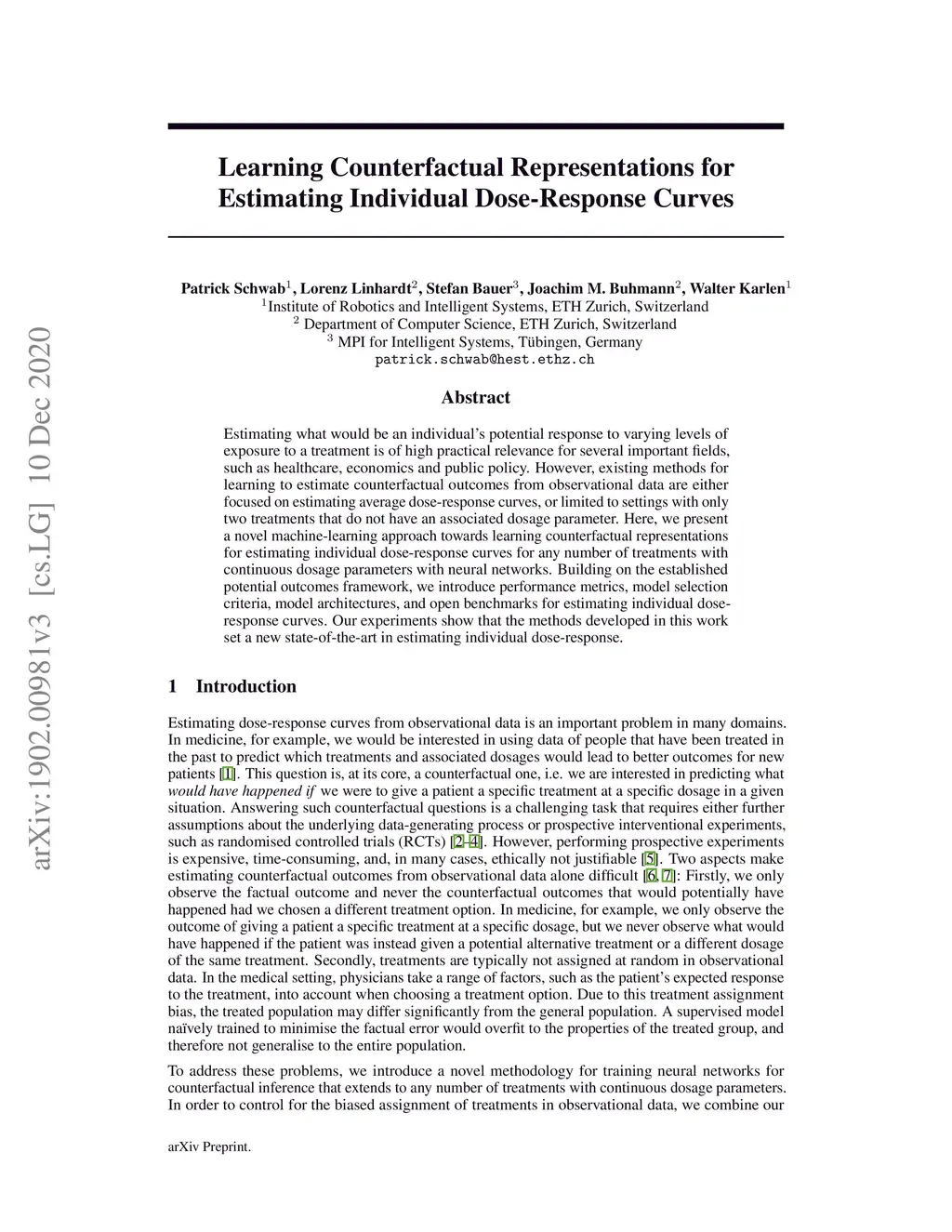 Estimating what would be an individual's potential response to varying levels of exposure to a treatment is of high practical relevance for several important fields, such as healthcare, economics and public policy. However, existing methods for learning to estimate counterfactual outcomes from observational data are either focused on estimating average dose-response curves, or limited to settings with only two treatments that do not have an associated dosage parameter. Here, we present a novel machine-learning approach towards learning counterfactual representations for estimating individual dose-response curves for any number of treatments with continuous dosage parameters with neural networks. Building on the established potential outcomes framework, we introduce performance metrics, model selection criteria, model architectures, and open benchmarks for estimating individual dose-response curves. Our experiments show that the methods developed in this work set a new state-of-the-art in estimating individual dose-response.