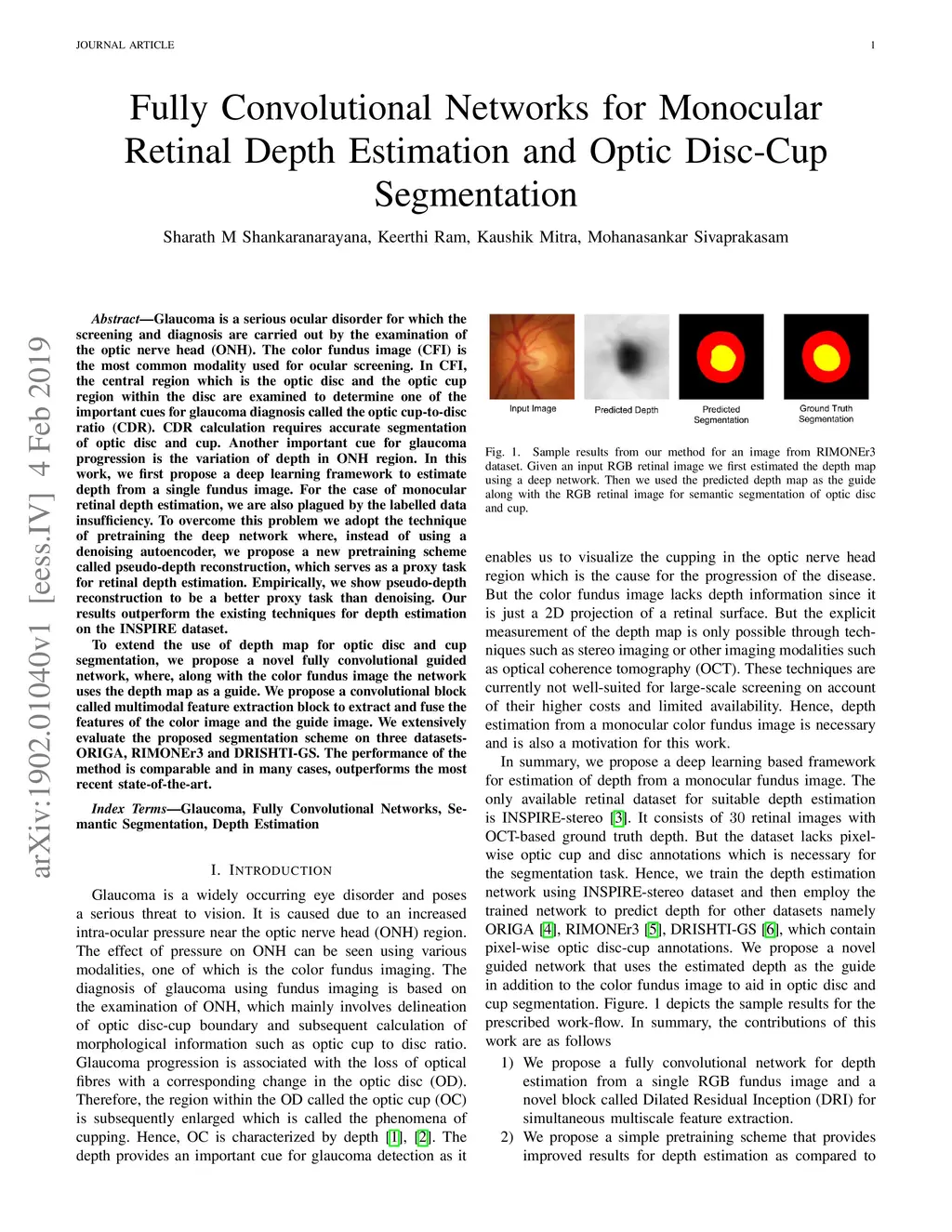 Glaucoma is a serious ocular disorder for which the screening and diagnosis are carried out by the examination of the optic nerve head (ONH). The color fundus image (CFI) is the most common modality used for ocular screening. In CFI, the central r