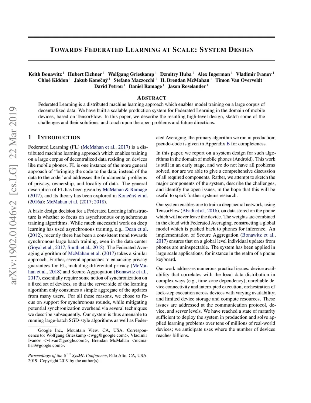 Federated Learning is a distributed machine learning approach which enables model training on a large corpus of decentralized data. We have built a scalable production system for Federated Learning in the domain of mobile devices, based on TensorFlow. In this paper, we describe the resulting high-level design, sketch some of the challenges and their solutions, and touch upon the open problems and future directions.