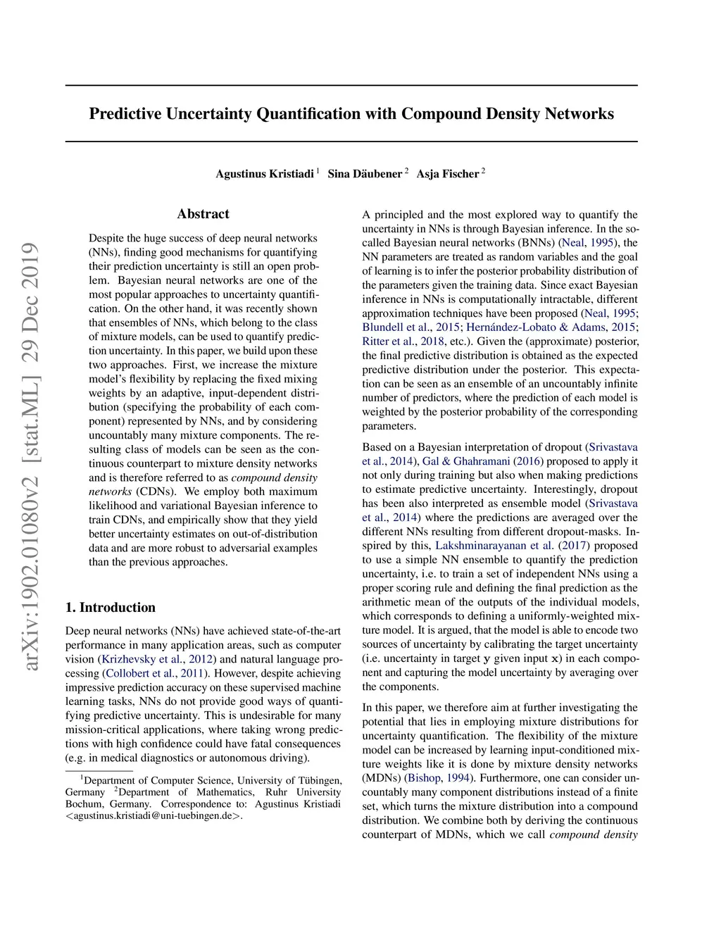 Despite the huge success of deep neural networks (NNs), finding good mechanisms for quantifying their prediction uncertainty is still an open problem. Bayesian neural networks are one of the most popular approaches to uncertainty quantification. On the other hand, it was recently shown that ensembles of NNs, which belong to the class of mixture models, can be used to quantify prediction uncertainty. In this paper, we build upon these two approaches. First, we increase the mixture model's flexibility by replacing the fixed mixing weights by an adaptive, input-dependent distribution (specifying the probability of each component) represented by NNs, and by considering uncountably many mixture components. The resulting class of models can be seen as the continuous counterpart to mixture density networks and is therefore referred to as compound density networks (CDNs). We employ both maximum likelihood and variational Bayesian inference to train CDNs, and empirically show that they yield better uncertainty estimates on out-of-distribution data and are more robust to adversarial examples than the previous approaches.