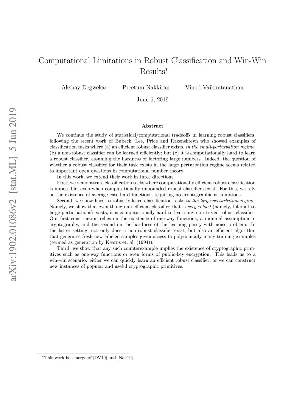 We continue the study of statistical/computational tradeoffs in learning robust classifiers, following the recent work of Bubeck, Lee, Price and Razenshteyn who showed examples of classification tasks where (a) an efficient robust classifier exists, in the small-perturbation regime; (b) a non-robust classifier can be learned efficiently; but (c) it is computationally hard to learn a robust classifier, assuming the hardness of factoring large numbers. The question of whether a robust classifier for their task exists in the large perturbation regime seems related to important open questions in computational number theory. In this work, we extend their work in three directions. First, we demonstrate classification tasks where computationally efficient robust classification is impossible, even when computationally unbounded robust classifiers exist. For this, we rely on the existence of average-case hard functions. Second, we show hard-to-robustly-learn classification tasks in the large-perturbation regime. Namely, we show that even though an efficient classifier that is robust to large perturbations exists, it is computationally hard to learn any non-trivial robust classifier. Our first construction relies on the existence of one-way functions, and the second on the hardness of the learning parity with noise problem. In the latter setting, not only does a non-robust classifier exist, but also an efficient algorithm that generates fresh new labeled samples given access to polynomially many training examples (termed as generation by Kearns et. al. (1994)). Third, we show that any such counterexample implies the existence of cryptographic primitives such as one-way functions. This leads us to a win-win scenario: either we can learn an efficient robust classifier, or we can construct new instances of cryptographic primitives.