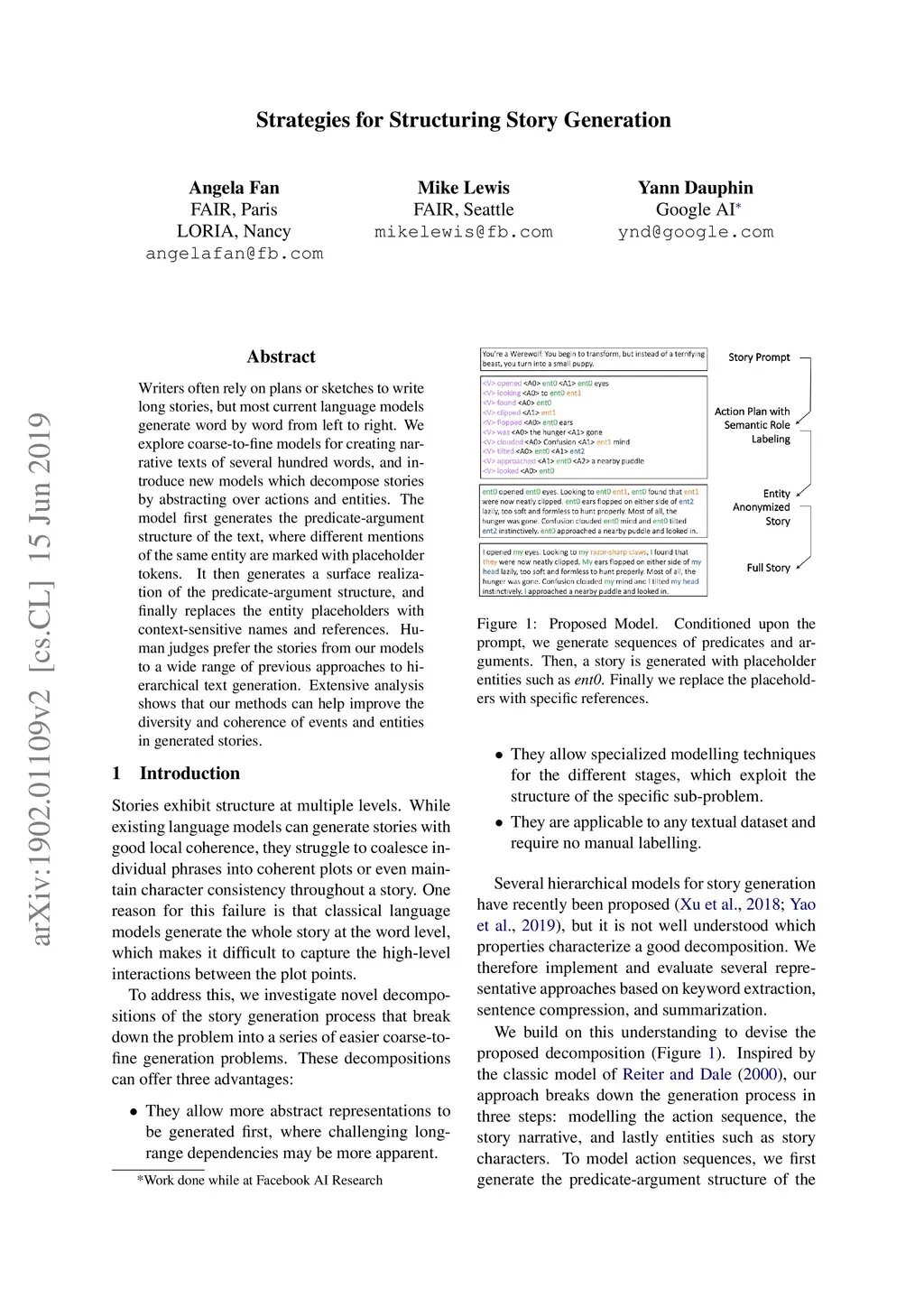 Writers generally rely on plans or sketches to write long stories, but most current language models generate word by word from left to right. We explore coarse-to-fine models for creating narrative texts of several hundred words, and introduce new models which decompose stories by abstracting over actions and entities. The model first generates the predicate-argument structure of the text, where different mentions of the same entity are marked with placeholder tokens. It then generates a surface realization of the predicate-argument structure, and finally replaces the entity placeholders with context-sensitive names and references. Human judges prefer the stories from our models to a wide range of previous approaches to hierarchical text generation. Extensive analysis shows that our methods can help improve the diversity and coherence of events and entities in generated stories.