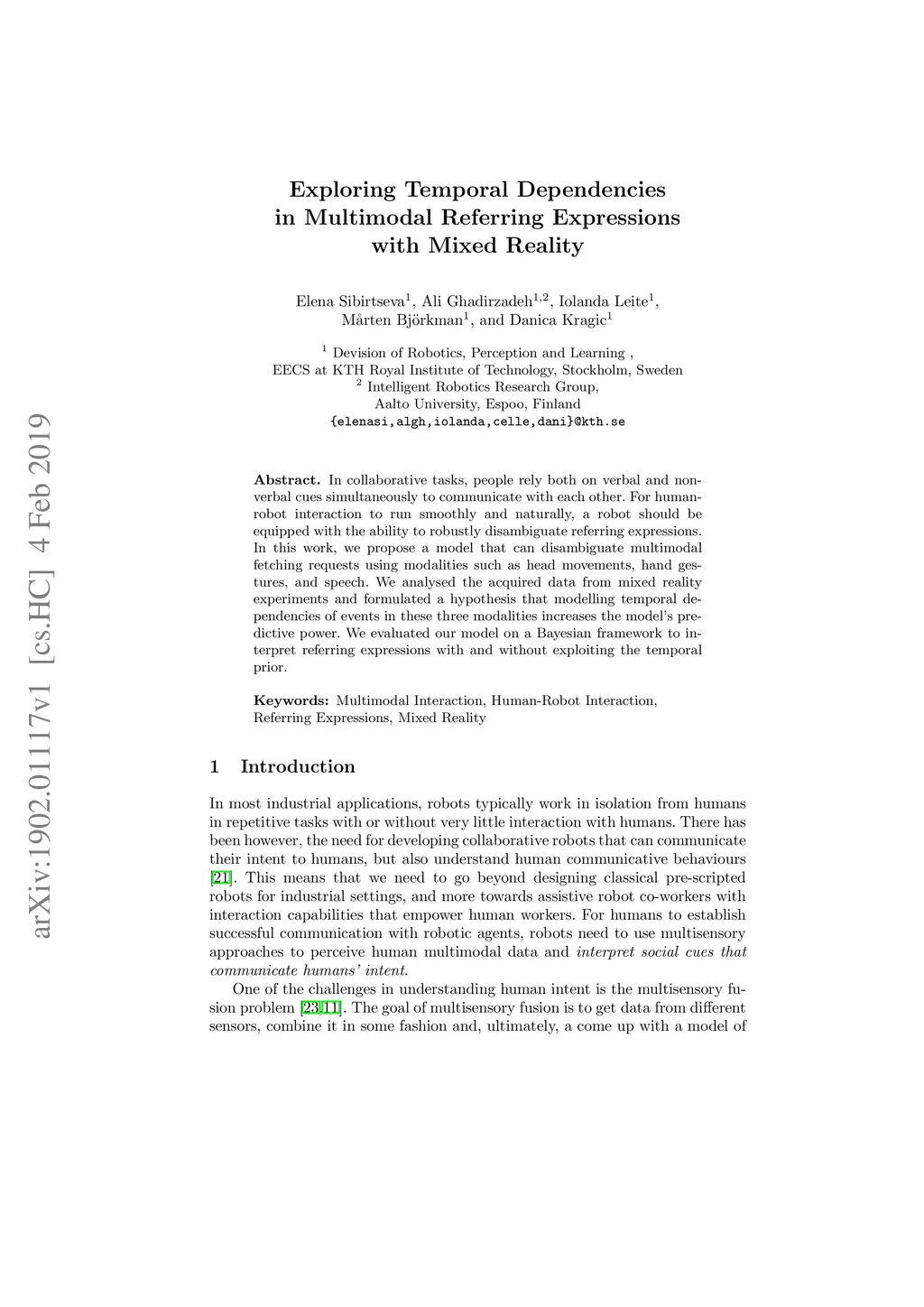In collaborative tasks, people rely both on verbal and non-verbal cues simultaneously to communicate with each other. For human-robot interaction to run smoothly and naturally, a robot should be equipped with the ability to robustly disambiguate referring expressions. In this work, we propose a model that can disambiguate multimodal fetching requests using modalities such as head movements, hand gestures, and speech. We analysed the acquired data from mixed reality experiments and formulated a hypothesis that modelling temporal dependencies of events in these three modalities increases the model's predictive power. We evaluated our model on a Bayesian framework to interpret referring expressions with and without exploiting a temporal prior.