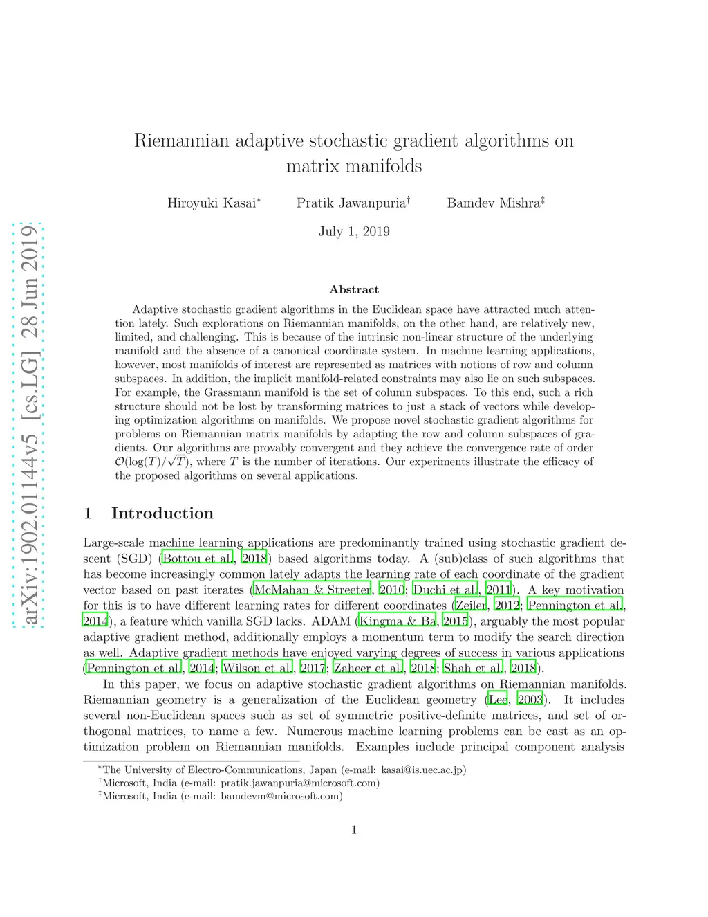 Adaptive stochastic gradient algorithms in the Euclidean space have attracted much attention lately. Such explorations on Riemannian manifolds, on the other hand, are relatively new, limited, and challenging. This is because of the intrinsic non-linear structure of the underlying manifold and the absence of a canonical coordinate system. In machine learning applications, however, most manifolds of interest are represented as matrices with notions of row and column subspaces. In addition, the implicit manifold-related constraints may also lie on such subspaces. For example, the Grassmann manifold is the set of column subspaces. To this end, such a rich structure should not be lost by transforming matrices to just a stack of vectors while developing optimization algorithms on manifolds. We propose novel stochastic gradient algorithms for problems on Riemannian matrix manifolds by adapting the row and column subspaces of gradients. Our algorithms are provably convergent and they achieve the convergence rate of order , where is the number of iterations. Our experiments illustrate the efficacy of the proposed algorithms on several applications.