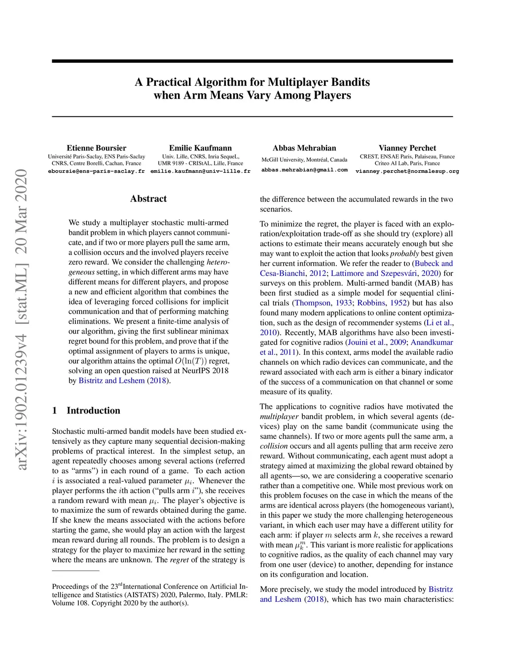 New Algorithms for Multiplayer Bandits when Arm Means Vary Among Players