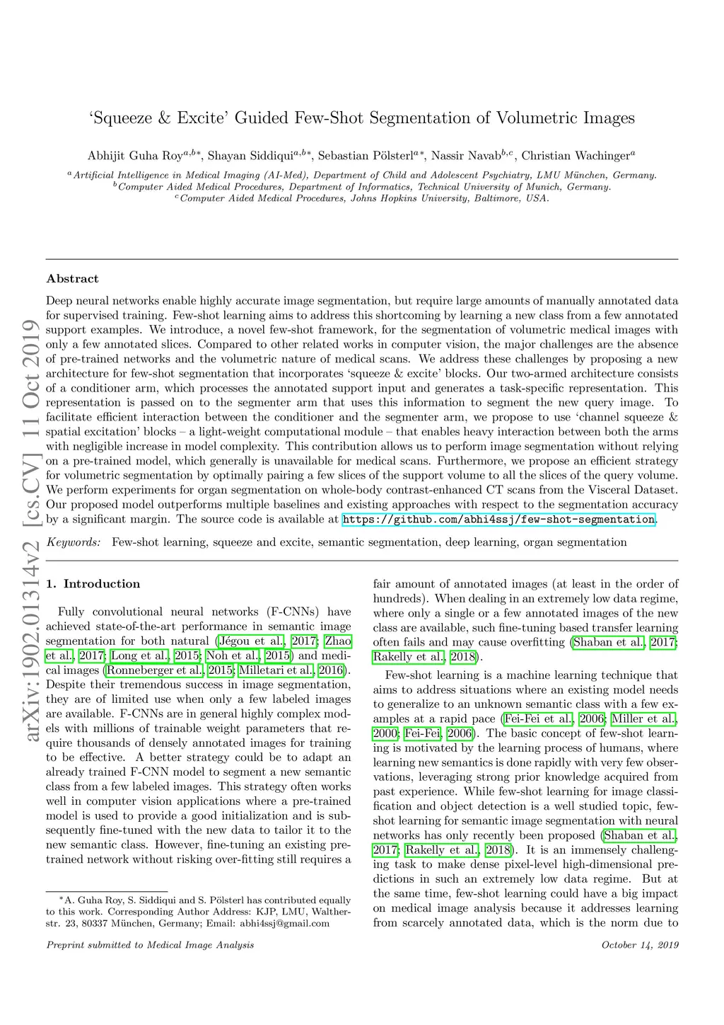 'Squeeze & Excite' Guided Few-Shot Segmentation of Volumetric Images