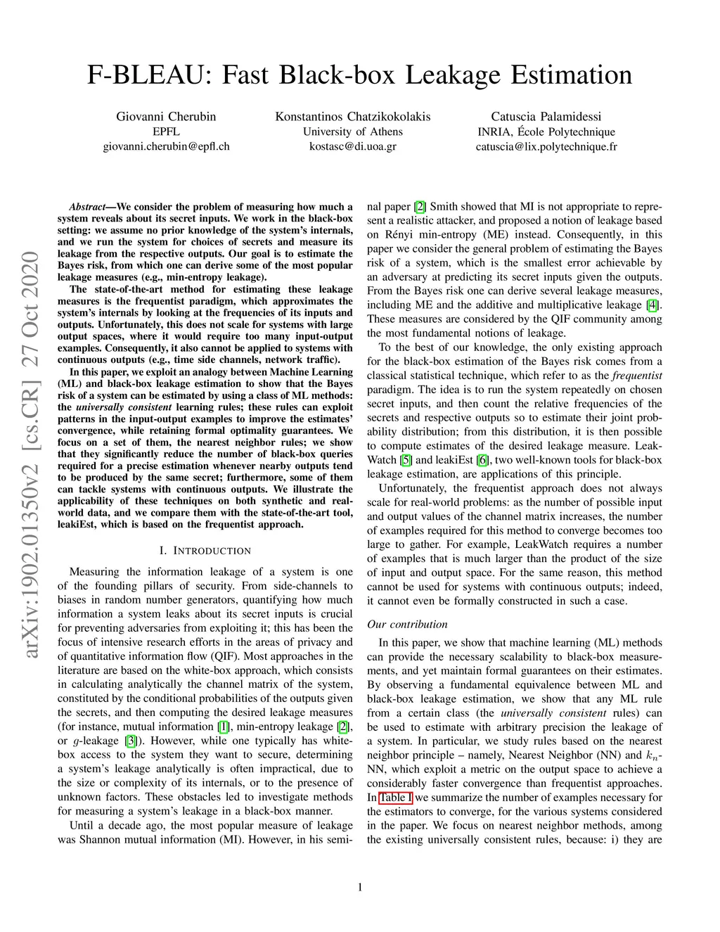 We consider the problem of measuring how much a system reveals about its secret inputs. We work under the black-box setting: we assume no prior knowledge of the system's internals, and we run the system for choices of secrets and measure its leakage from the respective outputs. Our goal is to estimate the Bayes risk, from which one can derive some of the most popular leakage measures (e.g., min-entropy, additive, and multiplicative leakage). The state-of-the-art method for estimating these leakage measures is the frequentist paradigm, which approximates the system's internals by looking at the frequencies of its inputs and outputs. Unfortunately, this does not scale for systems with large output spaces, where it would require too many input-output examples. Consequently, it also cannot be applied to systems with continuous outputs (e.g., time side channels, network traffic). In this paper, we exploit an analogy between Machine Learning (ML) and black-box leakage estimation to show that the Bayes risk of a system can be estimated by using a class of ML methods: the universally consistent learning rules; these rules can exploit patterns in the input-output examples to improve the estimates' convergence, while retaining formal optimality guarantees. We focus on a set of them, the nearest neighbor rules; we show that they significantly reduce the number of black-box queries required for a precise estimation whenever nearby outputs tend to be produced by the same secret; furthermore, some of them can tackle systems with continuous outputs. We illustrate the applicability of these techniques on both synthetic and real-world data, and we compare them with the state-of-the-art tool, leakiEst, which is based on the frequentist approach.