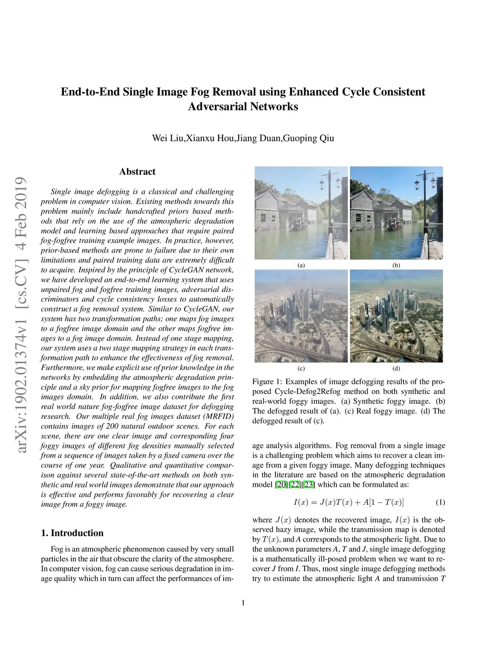 End-to-End Single Image Fog Removal using Enhanced Cycle Consistent