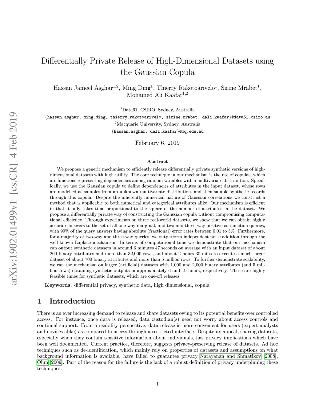 We propose a generic mechanism to efficiently release differentially private synthetic versions of high-dimensional datasets with high utility. The core technique in our mechanism is the use of copulas. Specifically, we use the Gaussian copula to define dependencies of attributes in the input dataset, whose rows are modelled as samples from an unknown multivariate distribution, and then sample synthetic records through this copula. Despite the inherently numerical nature of Gaussian correlations we construct a method that is applicable to both numerical and categorical attributes alike. Our mechanism is efficient in that it only takes time proportional to the square of the number of attributes in the dataset. We propose a differentially private way of constructing the Gaussian copula without compromising computational efficiency. Through experiments on three real-world datasets, we show that we can obtain highly accurate answers to the set of all one-way marginal, and two-and three-way positive conjunction queries, with 99\% of the query answers having absolute (fractional) error rates between 0.01 to 3\%. Furthermore, for a majority of two-way and three-way queries, we outperform independent noise addition through the well-known Laplace mechanism. In terms of computational time we demonstrate that our mechanism can output synthetic datasets in around 6 minutes 47 seconds on average with an input dataset of about 200 binary attributes and more than 32,000 rows, and about 2 hours 30 mins to execute a much larger dataset of about 700 binary attributes and more than 5 million rows. To further demonstrate scalability, we ran the mechanism on larger (artificial) datasets with 1,000 and 2,000 binary attributes (and 5 million rows) obtaining synthetic outputs in approximately 6 and 19 hours, respectively.