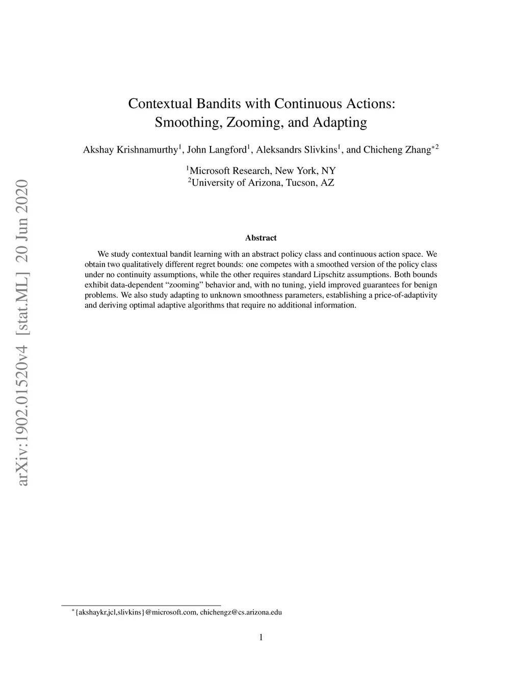 Contextual Bandits with Continuous Actions: Smoothing, Zooming, and