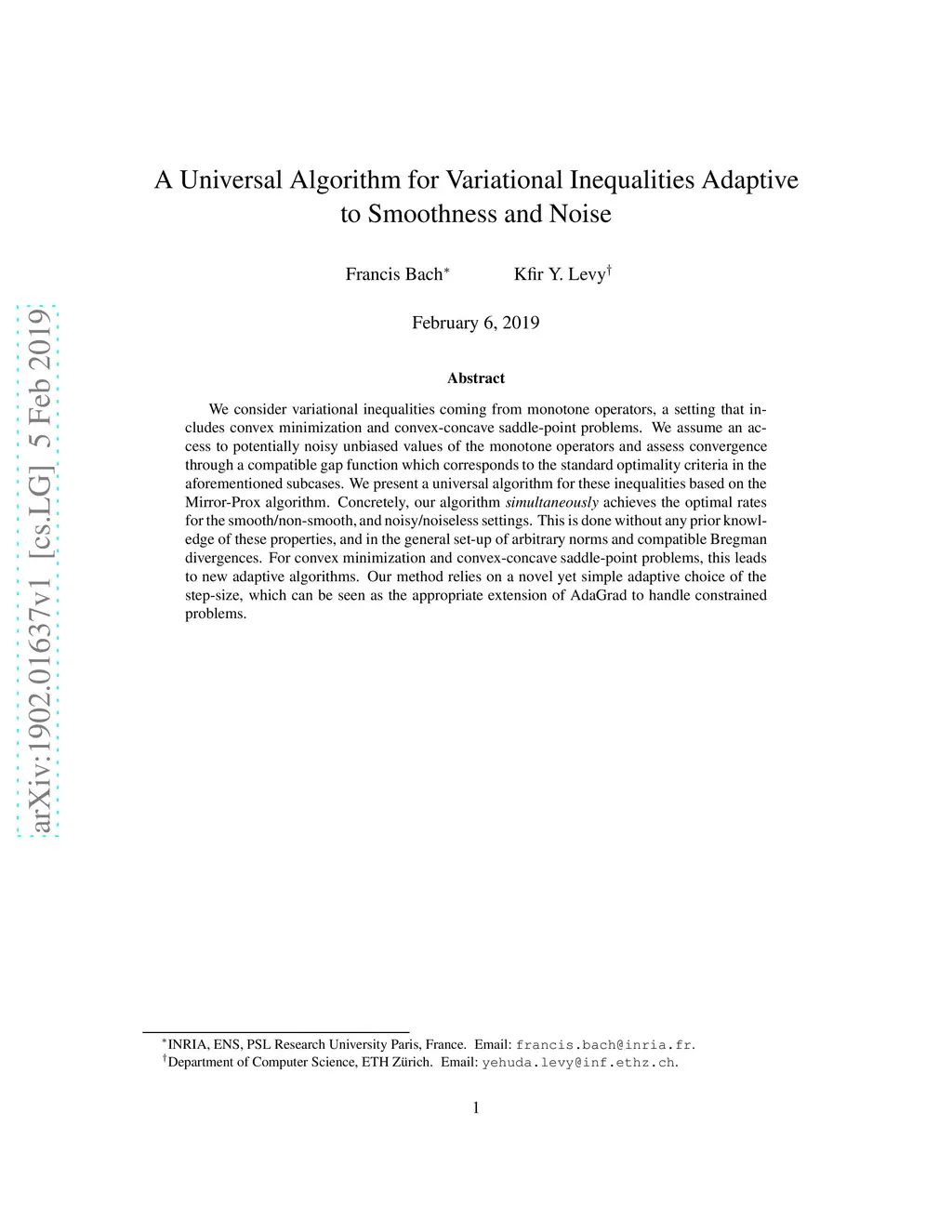 We consider variational inequalities coming from monotone operators, a setting that includes convex minimization and convex-concave saddle-point problems. We assume an access to potentially noisy unbiased values of the monotone operators and assess convergence through a compatible gap function which corresponds to the standard optimality criteria in the aforementioned subcases. We present a universal algorithm for these inequalities based on the Mirror-Prox algorithm. Concretely, our algorithm simultaneously achieves the optimal rates for the smooth/non-smooth, and noisy/noiseless settings. This is done without any prior knowledge of these properties, and in the general set-up of arbitrary norms and compatible Bregman divergences. For convex minimization and convex-concave saddle-point problems, this leads to new adaptive algorithms. Our method relies on a novel yet simple adaptive choice of the step-size, which can be seen as the appropriate extension of AdaGrad to handle constrained problems.