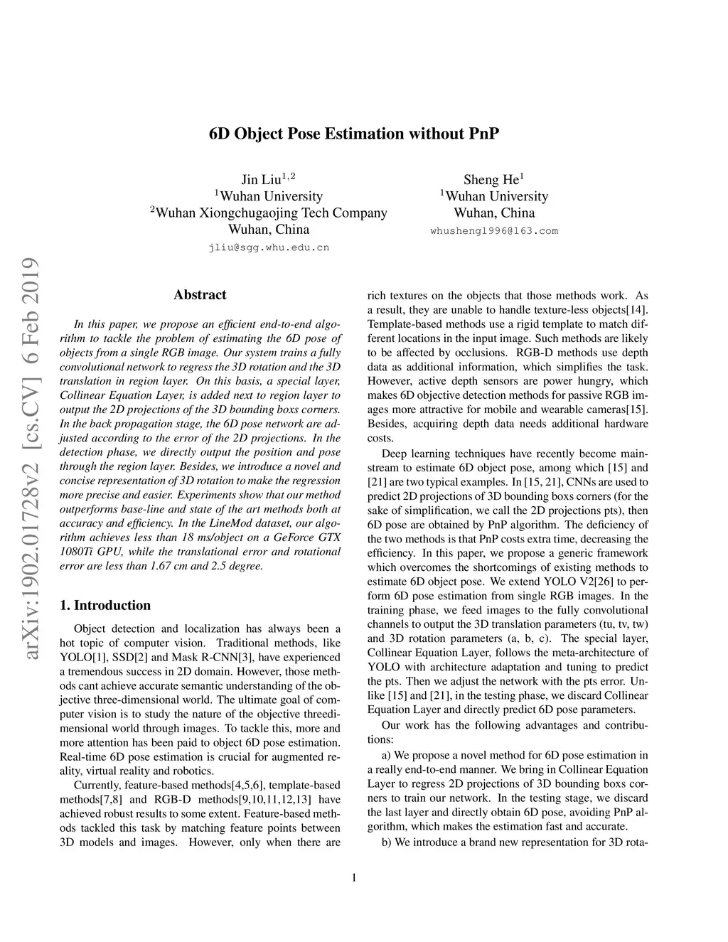 In this paper, we propose an efficient end-to-end algorithm to tackle the problem of estimating the 6D pose of objects from a single RGB image. Our system trains a fully convolutional network to regress the 3D rotation and the 3D translation in region layer. On this basis, a special layer, Collinear Equation Layer, is added next to region layer to output the 2D projections of the 3D bounding boxs corners. In the back propagation stage, the 6D pose network are adjusted according to the error of the 2D projections. In the detection phase, we directly output the position and pose through the region layer. Besides, we introduce a novel and concise representation of 3D rotation to make the regression more precise and easier. Experiments show that our method outperforms base-line and state of the art methods both at accuracy and efficiency. In the LineMod dataset, our algorithm achieves less than 18 ms/object on a GeForce GTX 1080Ti GPU, while the translational error and rotational error are less than 1.67 cm and 2.5 degree.